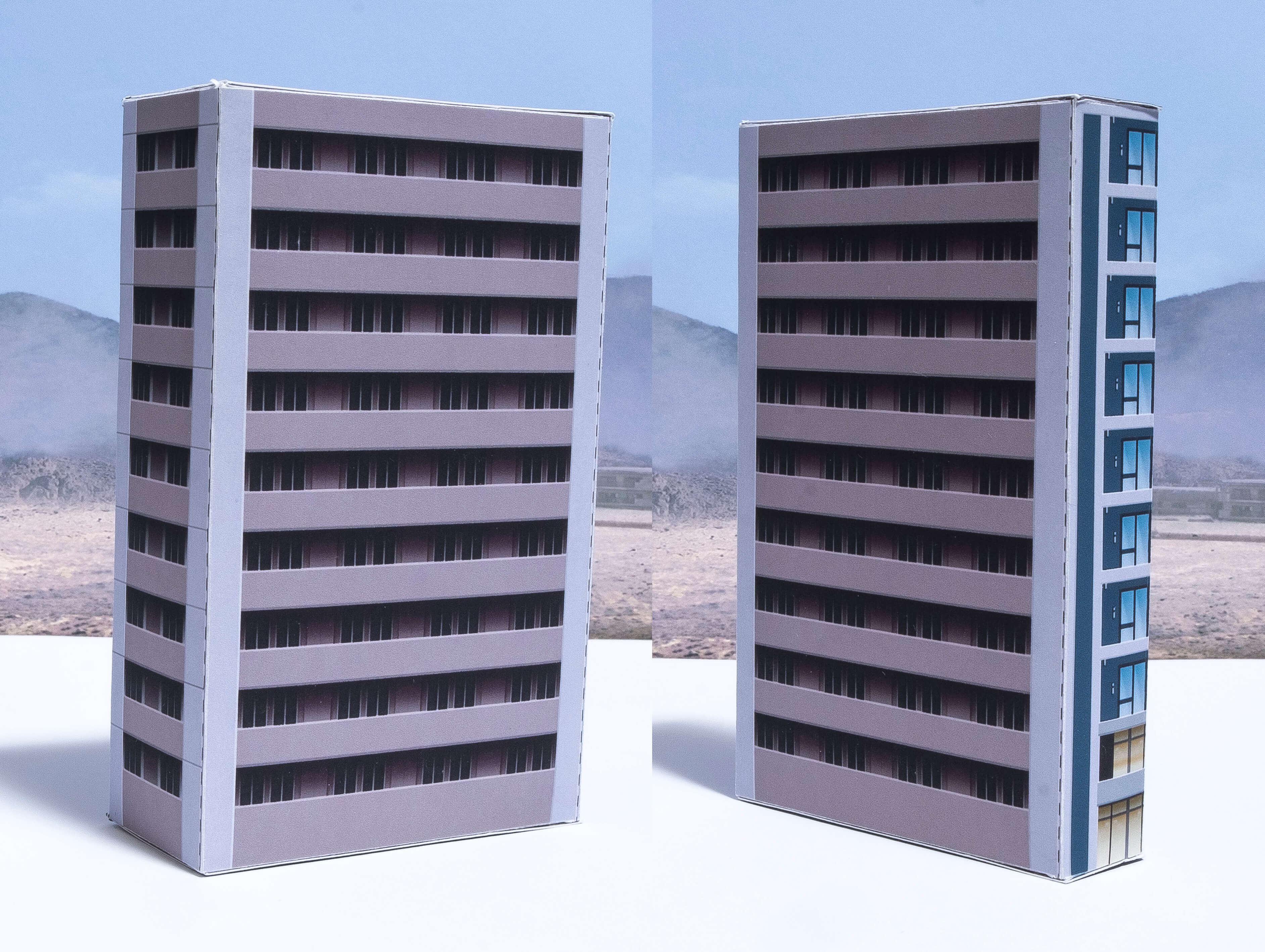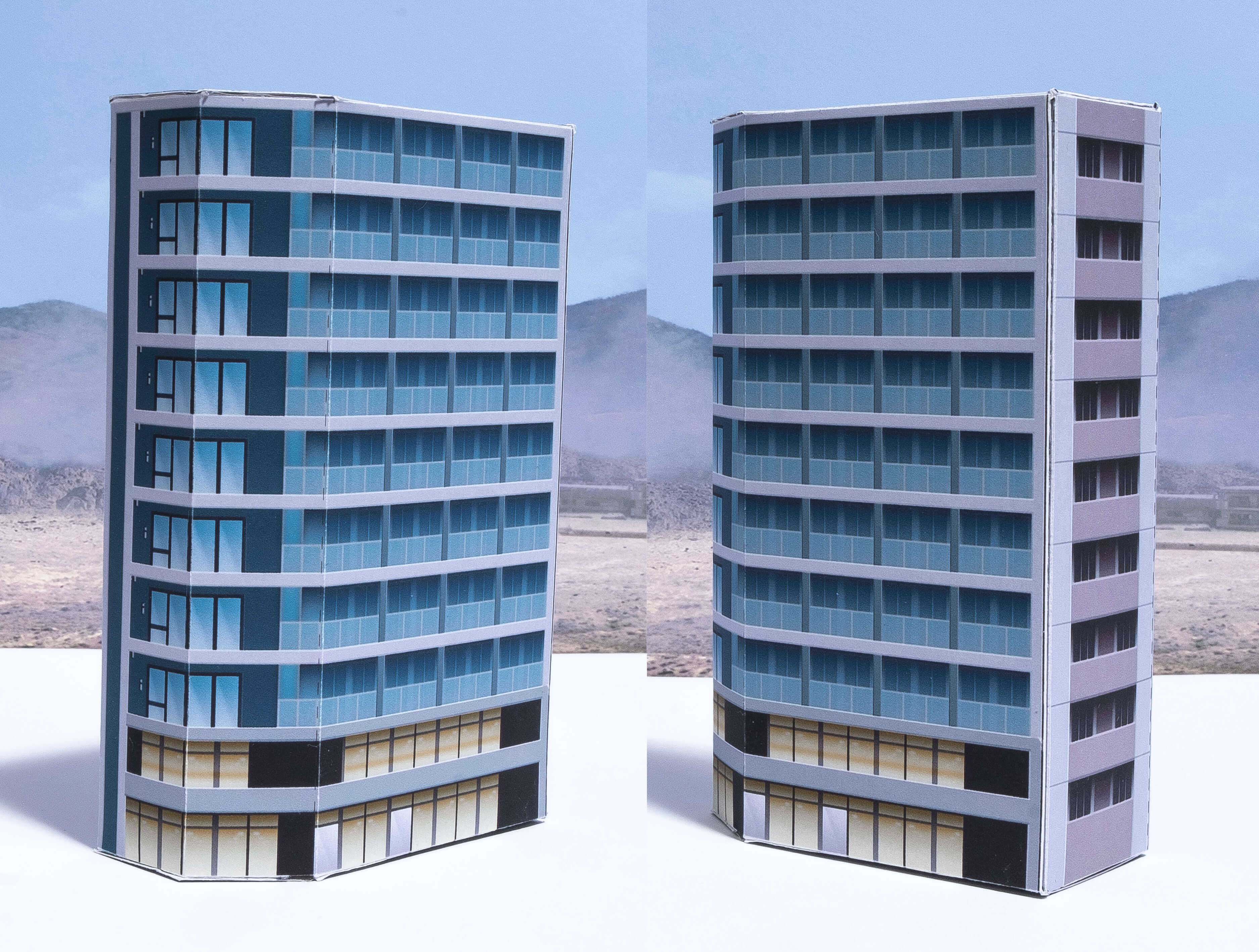 左右反転して印刷をすれば各向きに対応して置くことができます。裏面の窓が無い方は角ビル仕様になっていないので通常のマンションタイプのビルとして使えます。