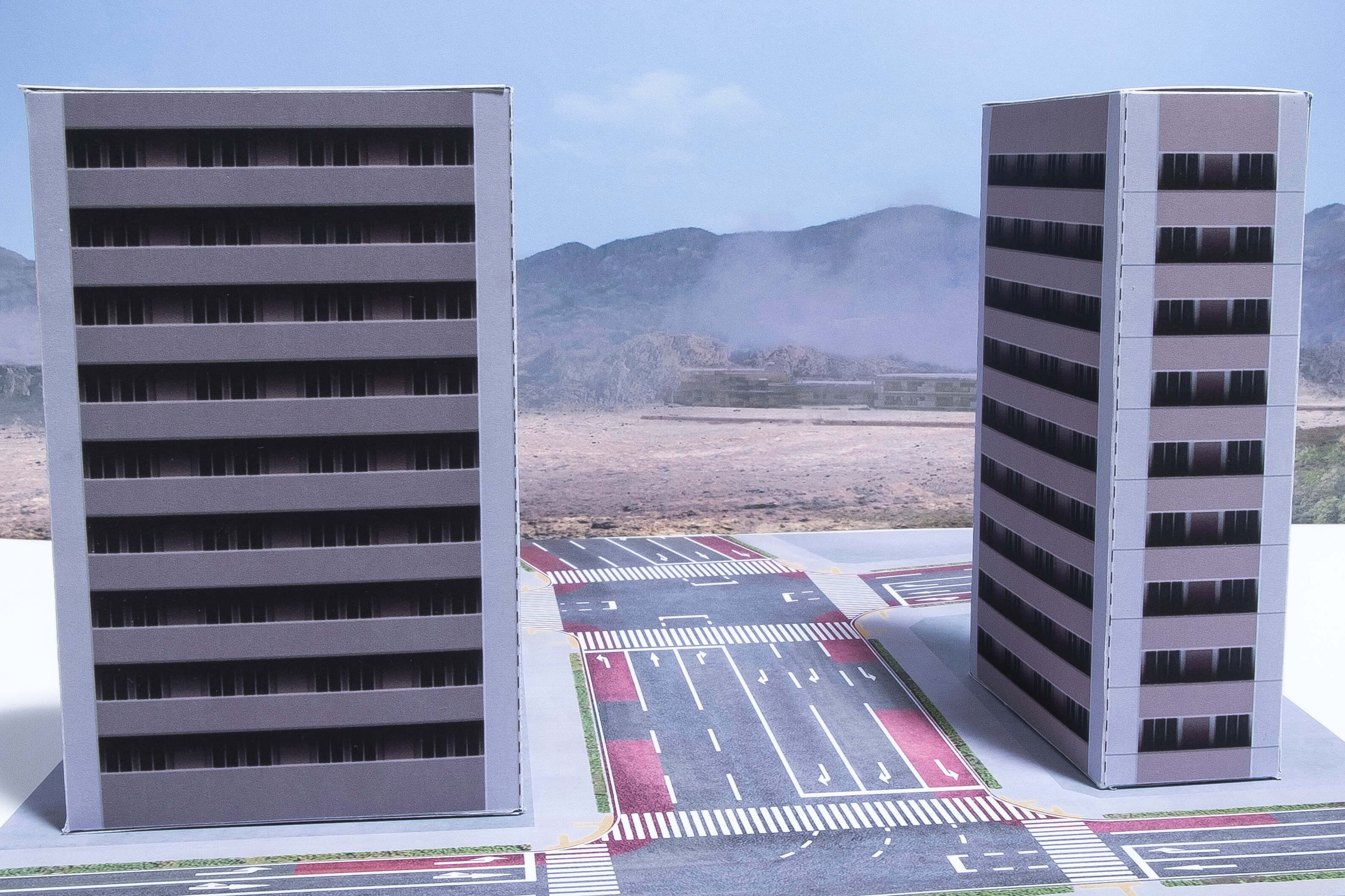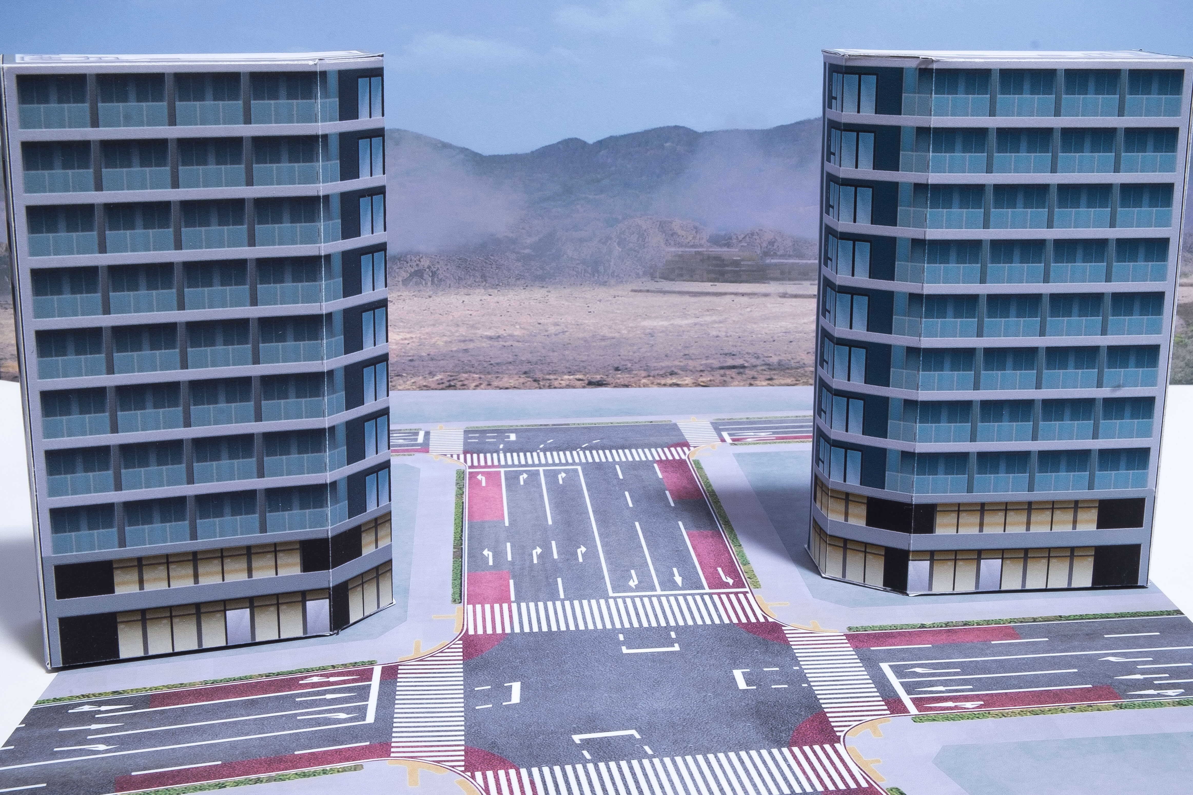 次に、A4の道路シートを2枚使い縦長のジオラマを作ります。ビルとビルの隙間などが見えないように大きいビルで隠しながら配置しました。少し難しい配置ですが、街の広さが感じられるので是非挑戦してみてください。