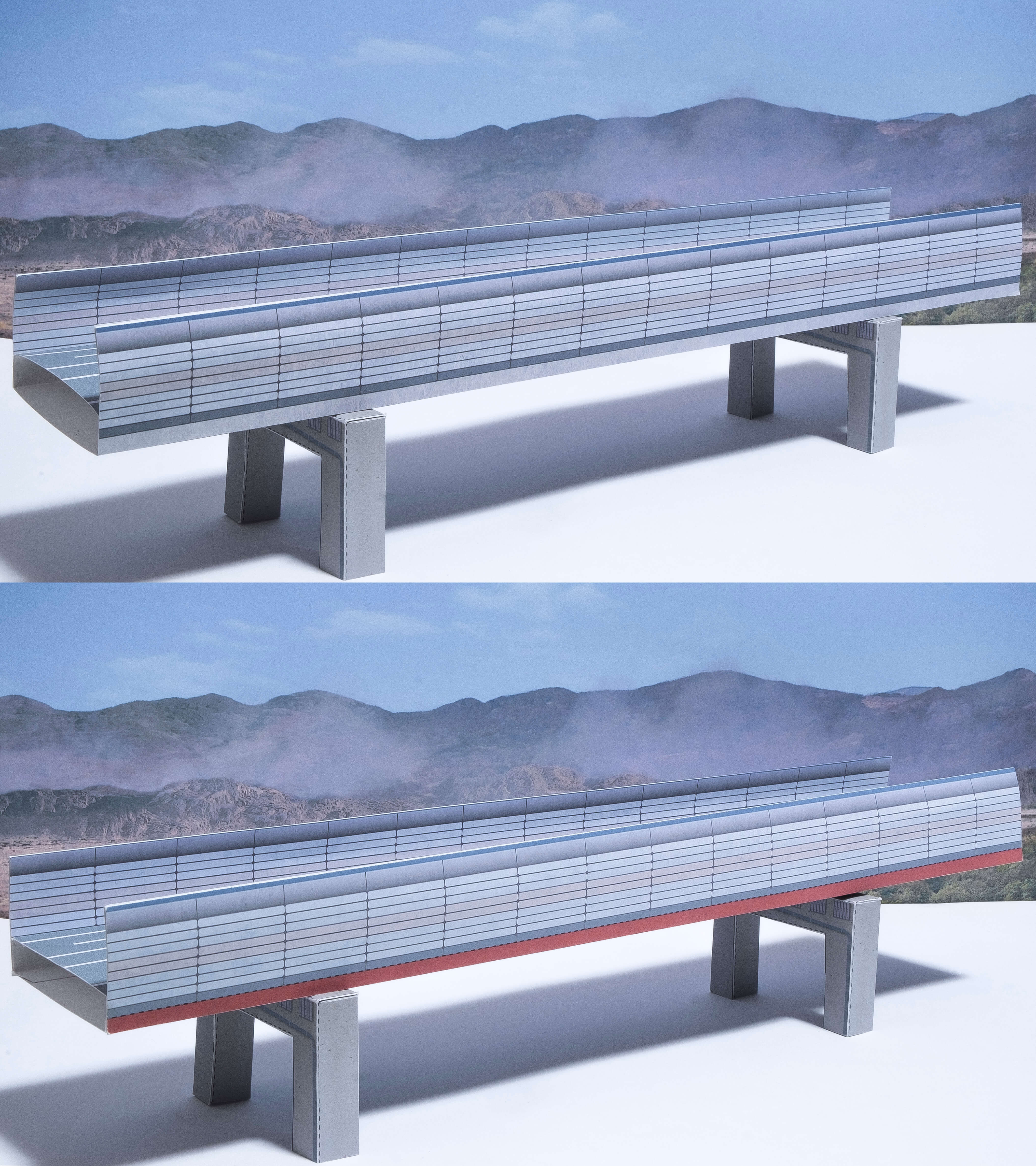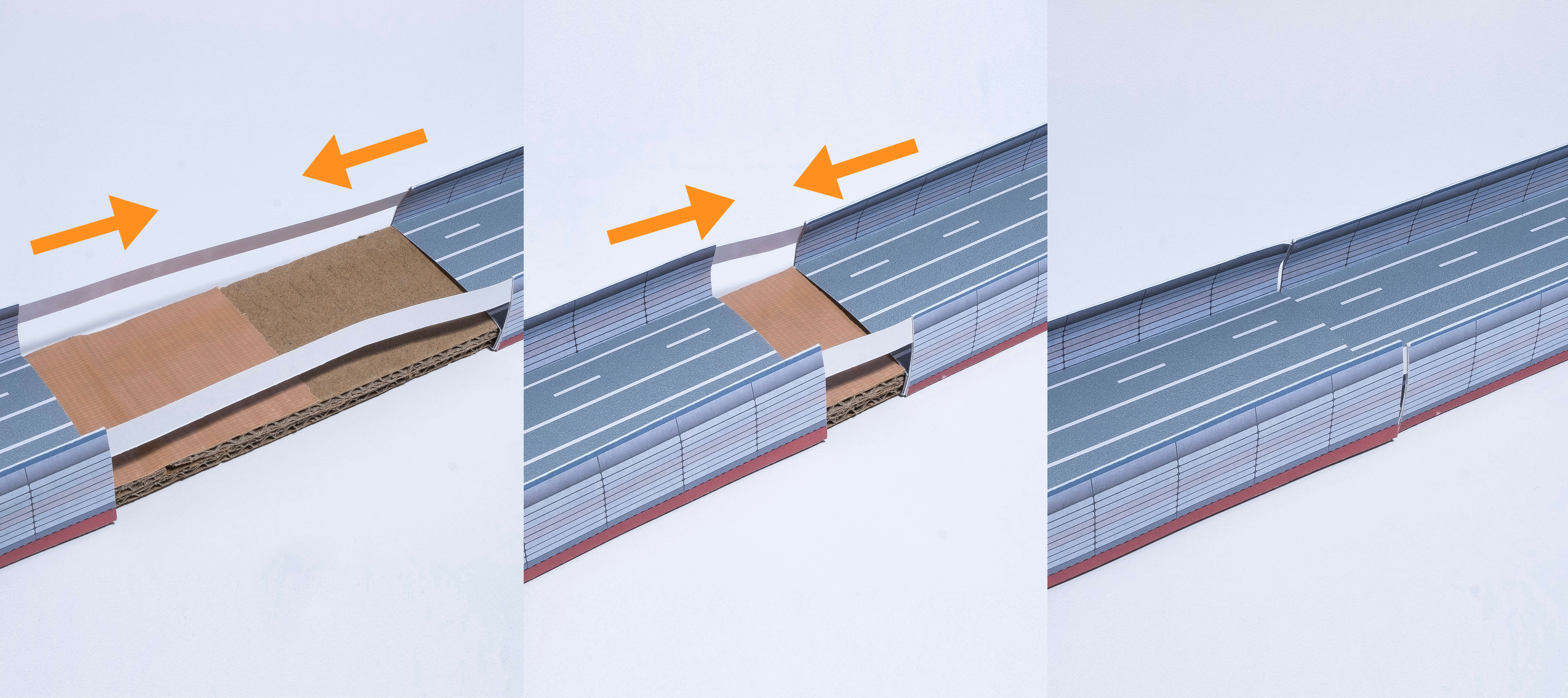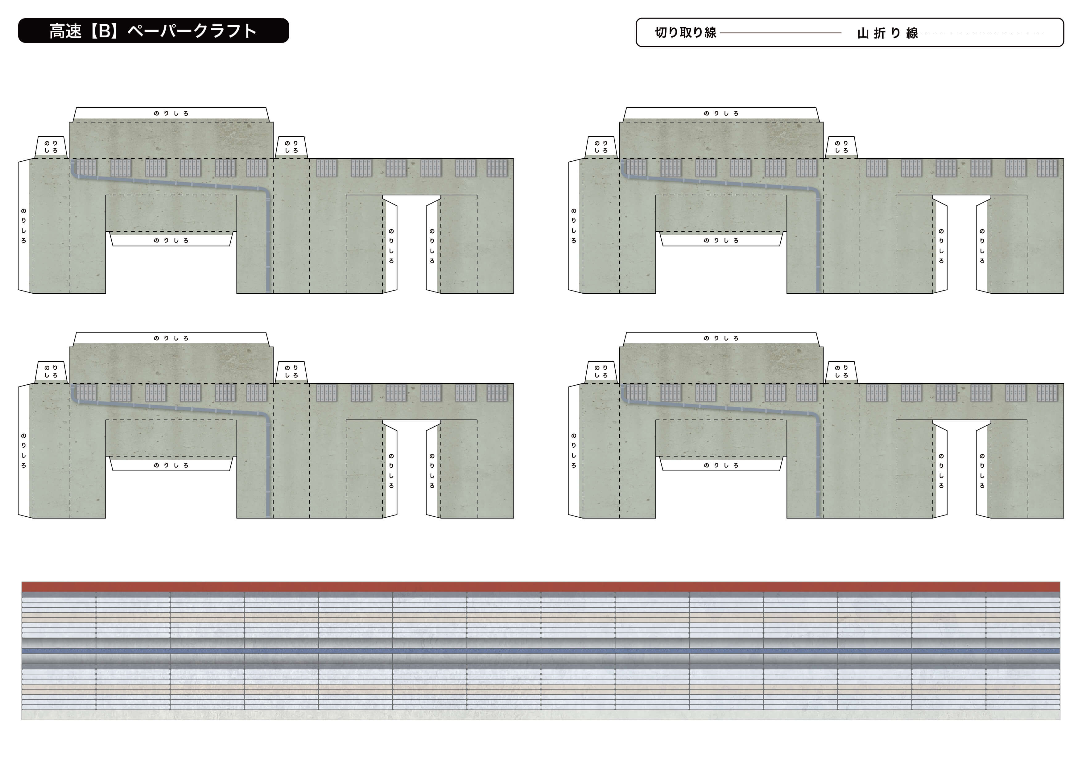 次は高速道路です。道路部分下部の色を、グレーか赤を選択して好みの色で組み立てられます。壁は今回は指で軽く曲げて丸みを付けていますが真っすぐでもお好きな方で組み立ててください。