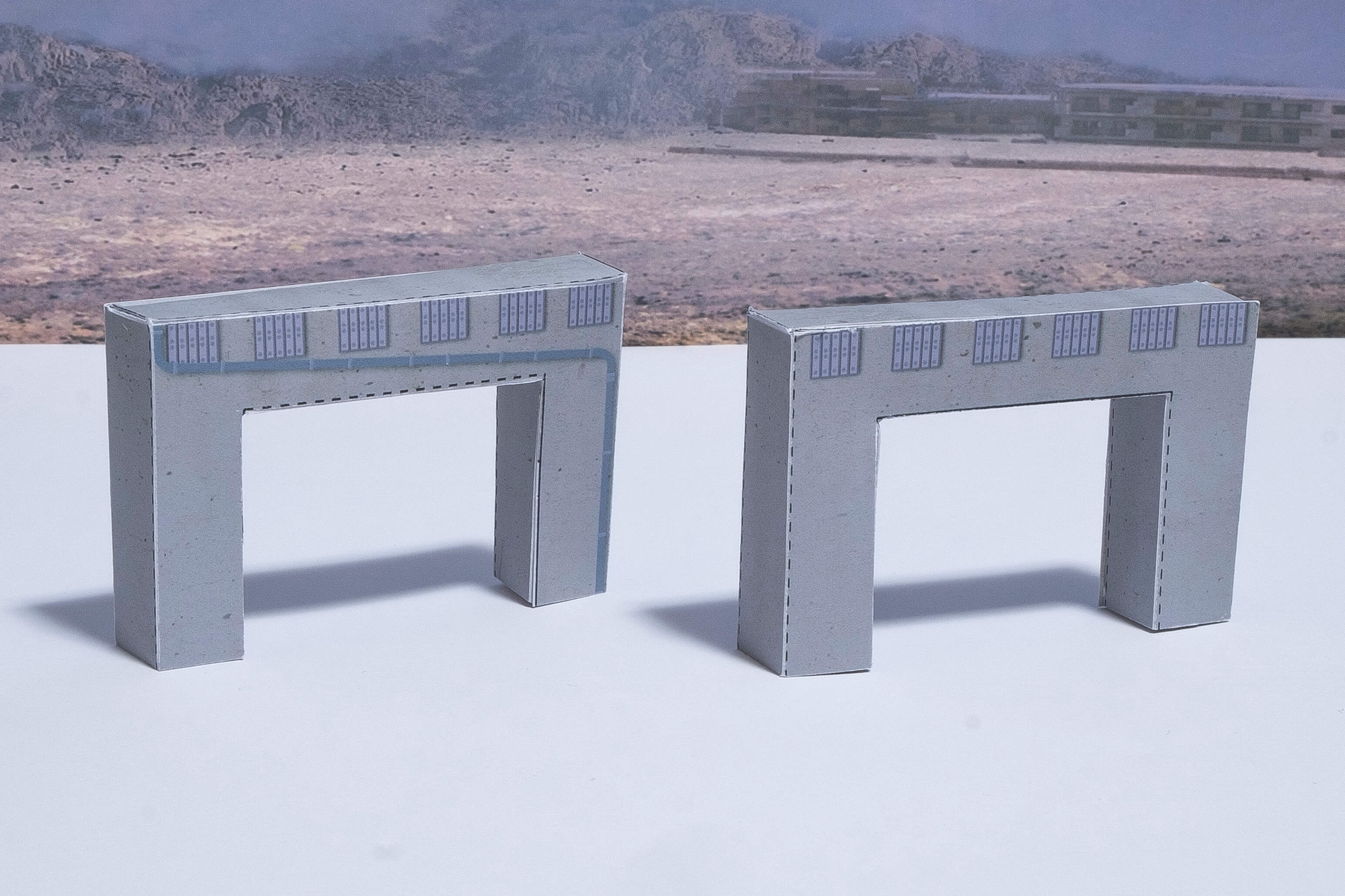 橋脚はパイプがある面と無い面があります。こちらもお好みの面が見えるような向きで置いてください。道路と橋脚は接着せずに載せるだけでも使えます。