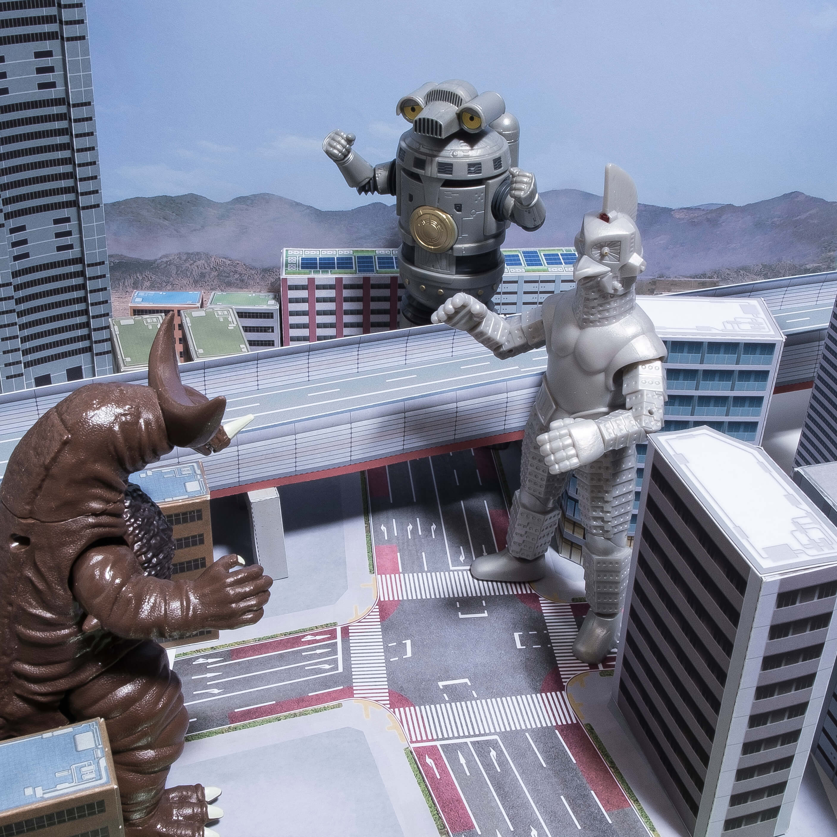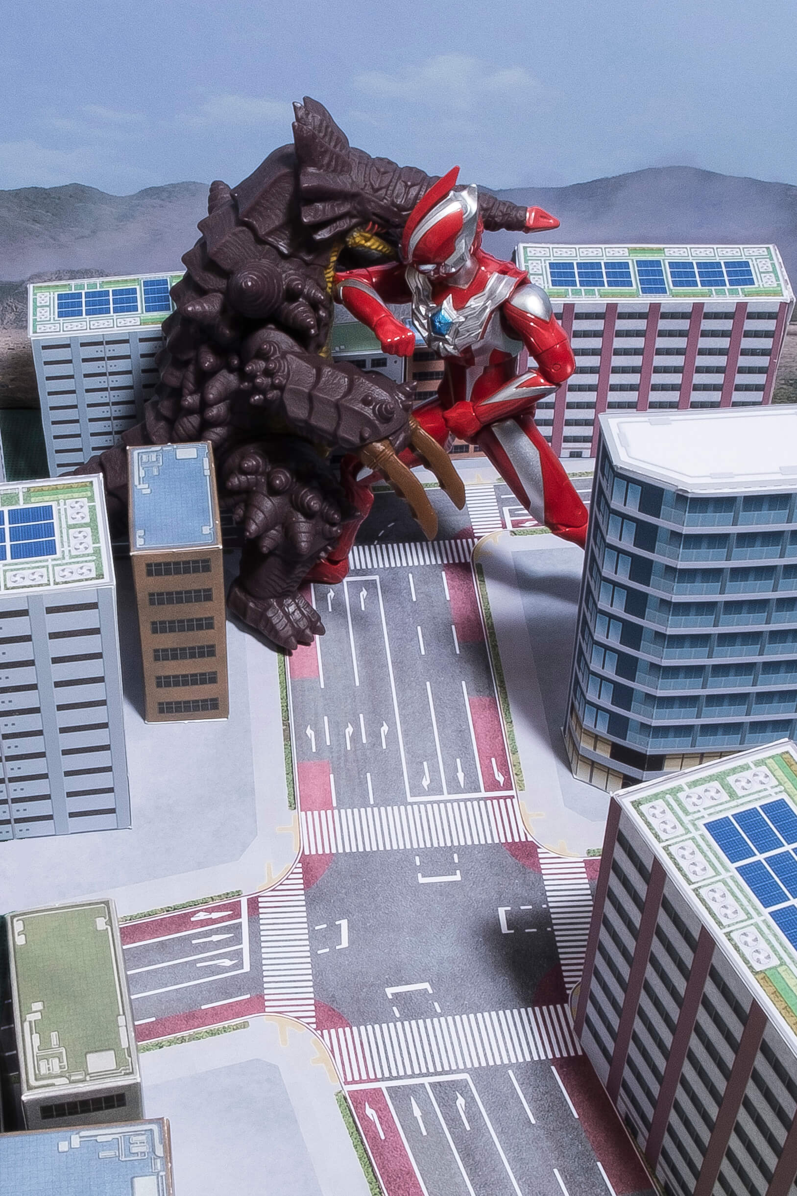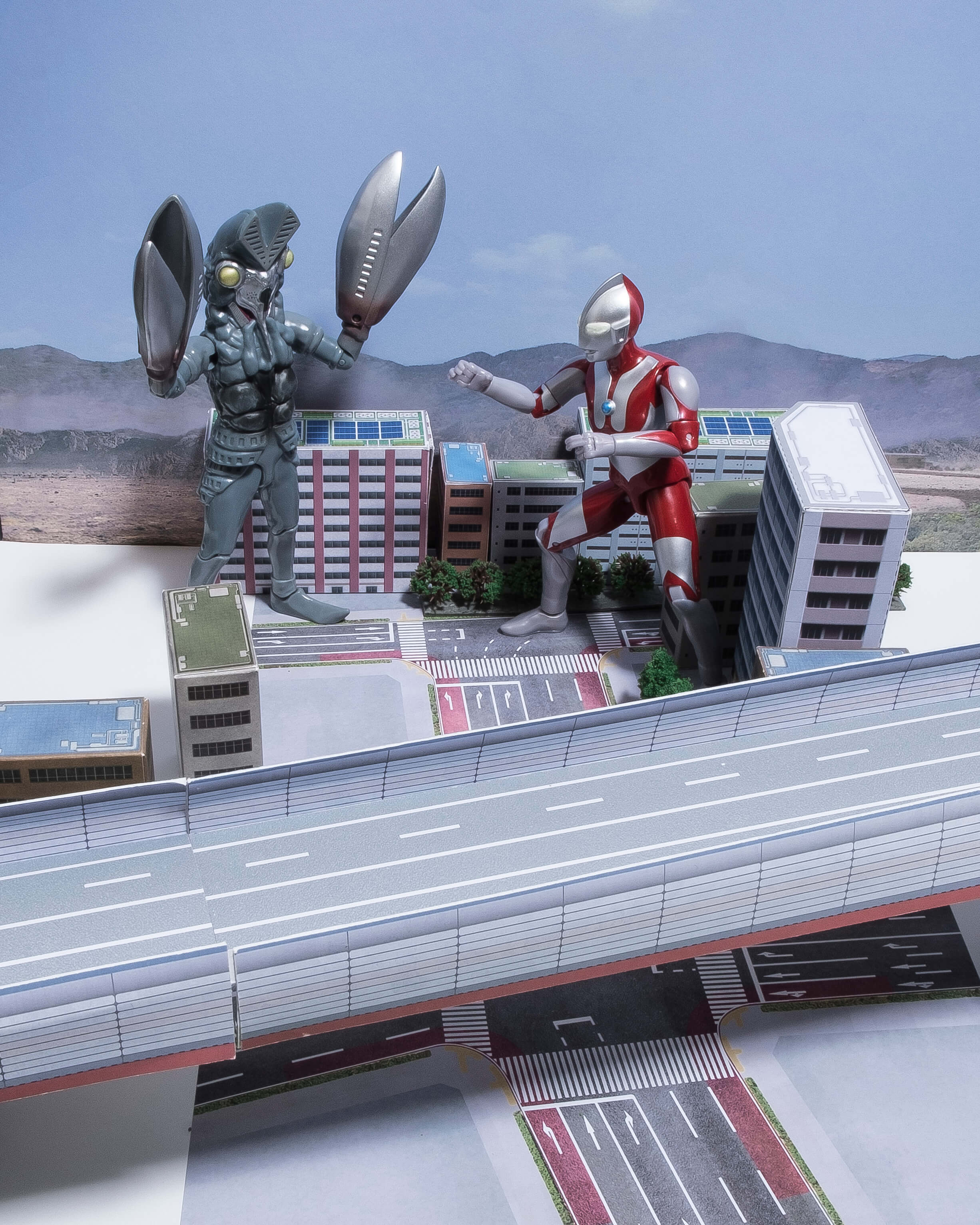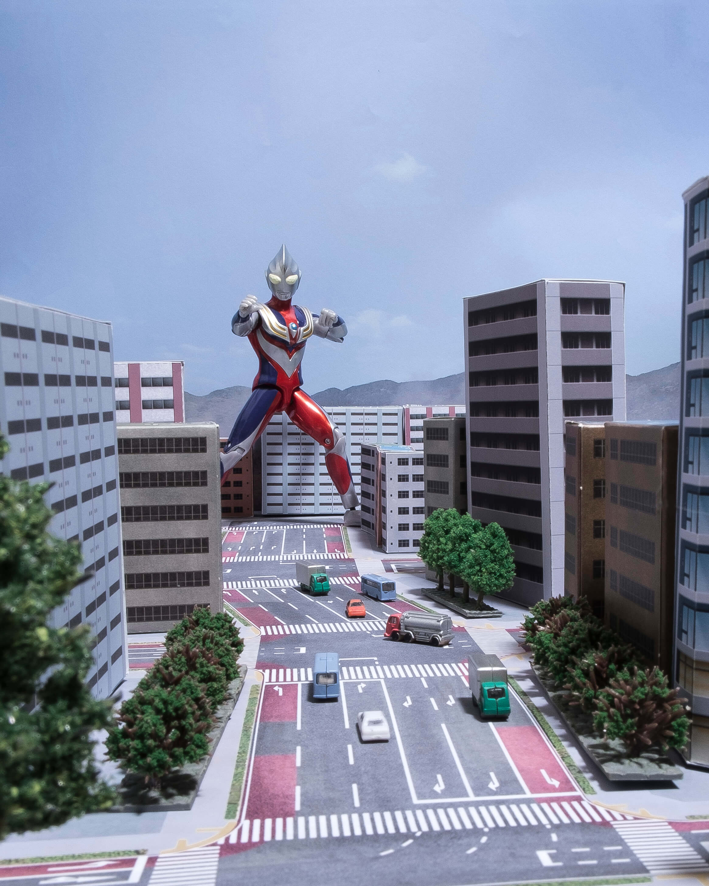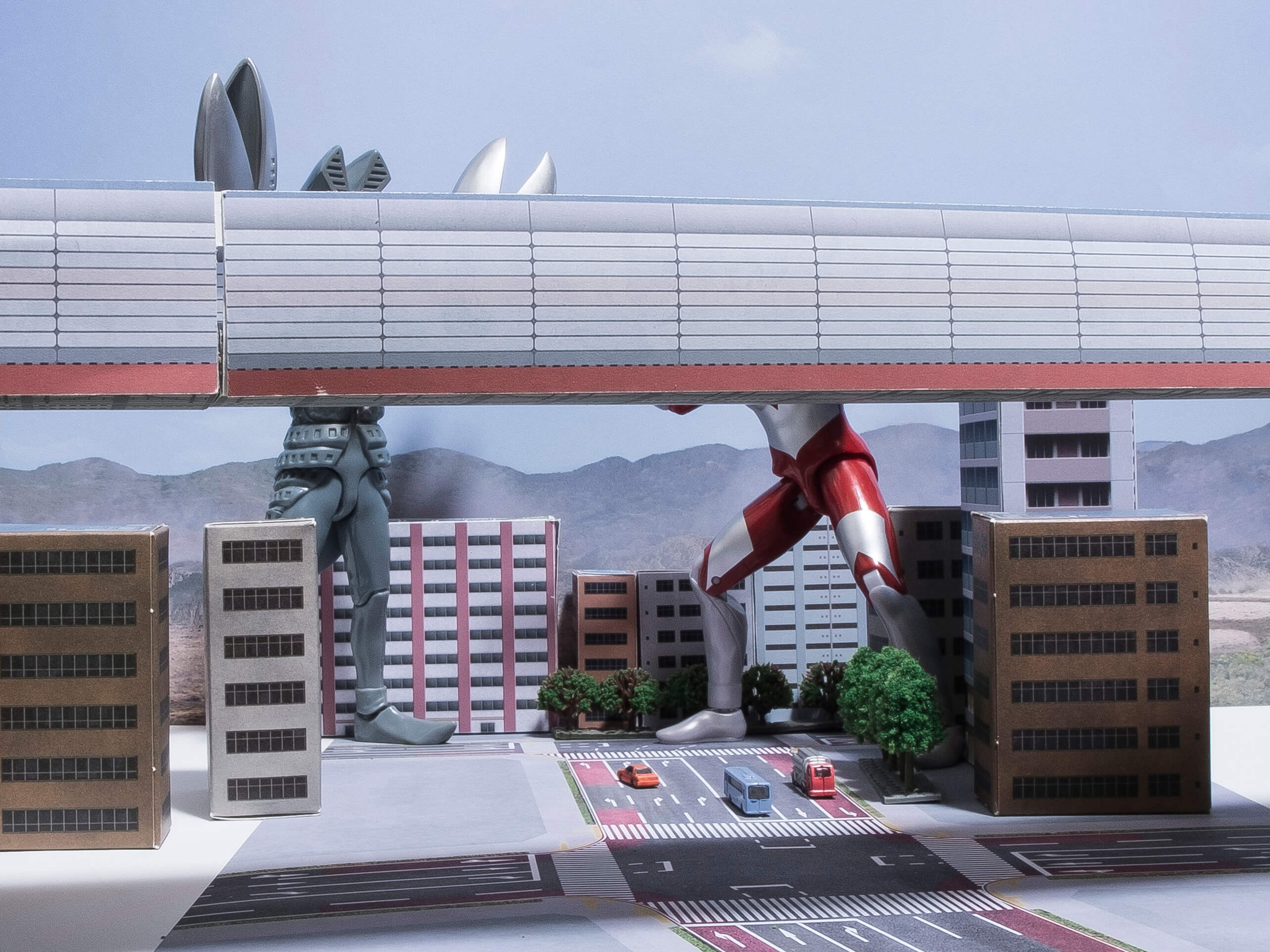次に、フィギュアを道路シート上に配置しやや俯瞰気味な角度から撮影しました。道路が良く見えますね。