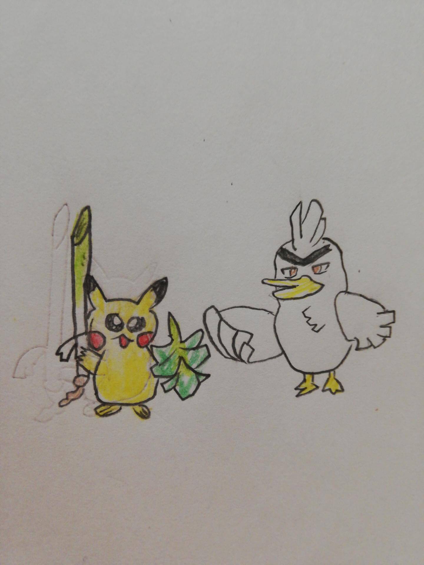 ネギガナイトの剣と盾をピカチュウが取ってネギガナイトが「かえして!」と言ってます。