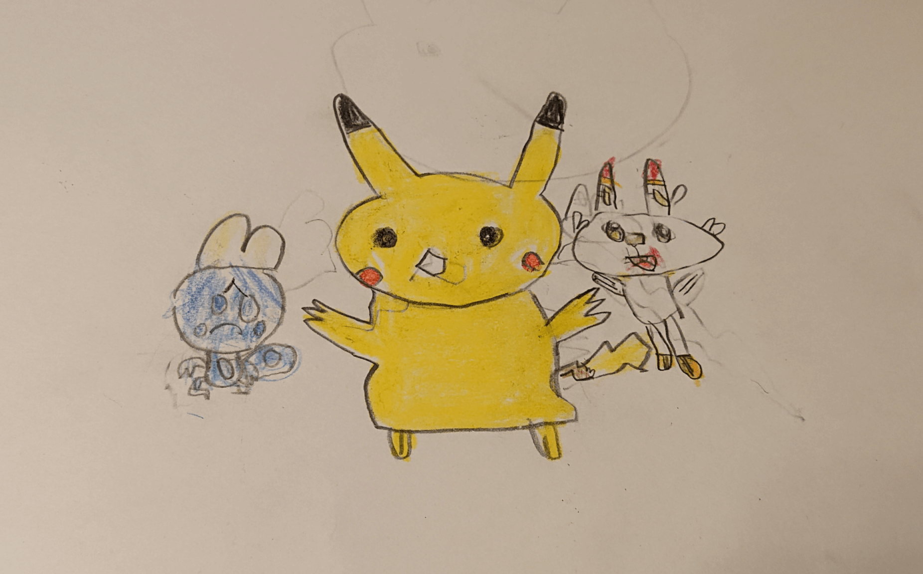 メソメソしているメッソンを、ピカチュウとヒバニーが笑顔にしようとしています
