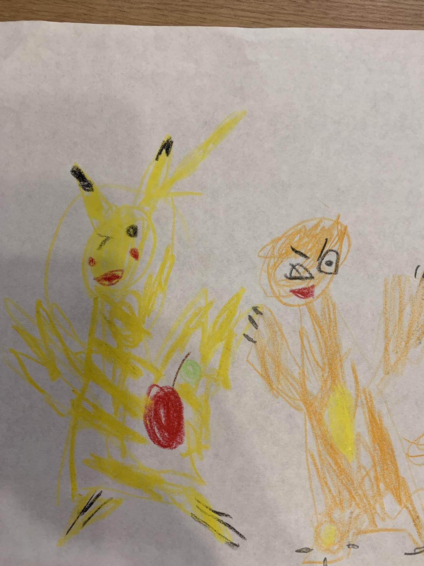 ピカチュウとヒトカゲがリンゴをなかよくわけています。