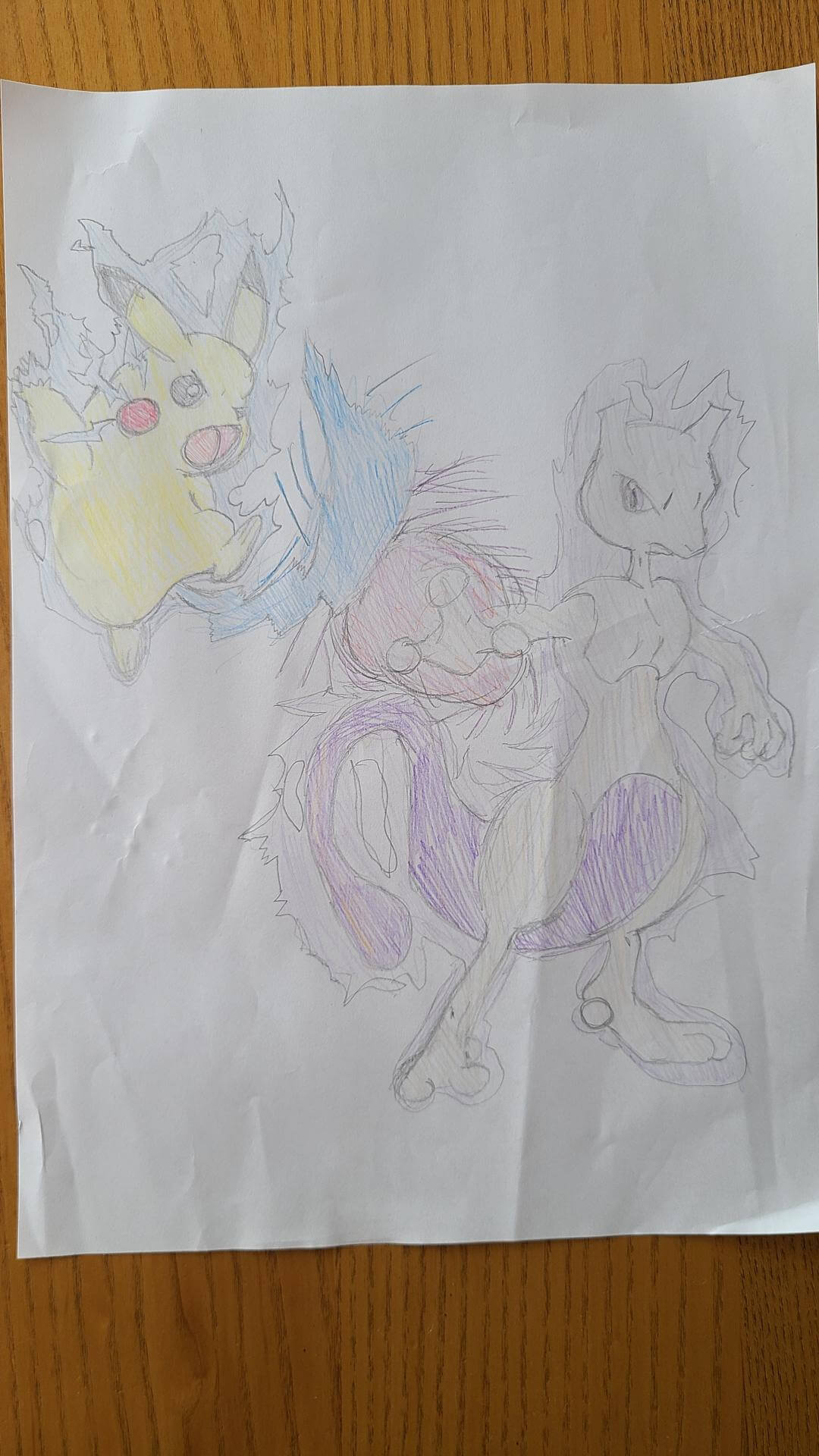 アニメの中でピカチュウがミュウツーに負けたことがあるので、第二回戦を描きました。今度こそ、ピカチュウが勝つかも!?