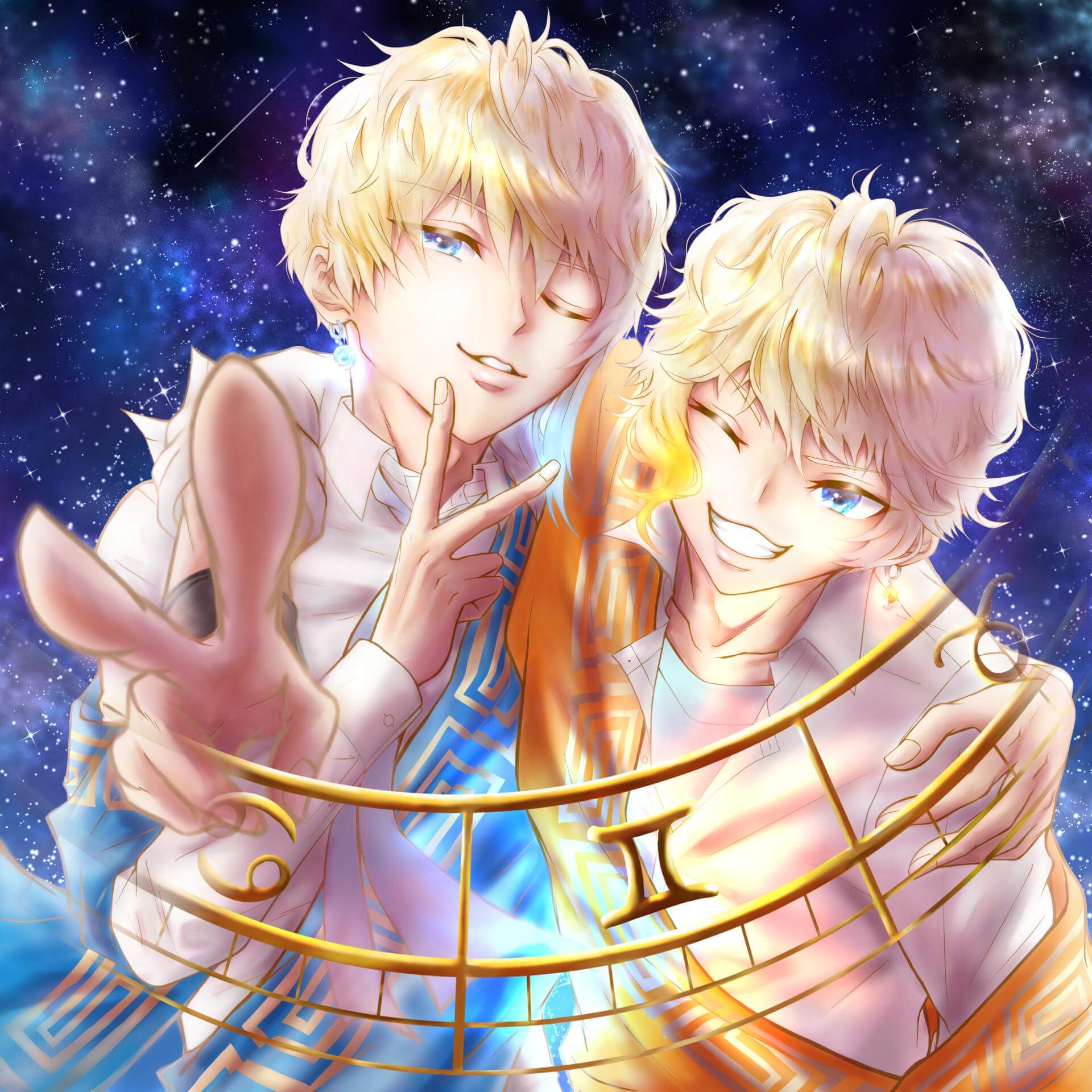 応援してくださる皆さんに心から感謝いたします。本当にありがとうございました🙇♀️そして双子座再投稿です😅子供から前の絵が眩し過ぎて見にくいと言われました。光と影のメリハリをつけ、宇宙や星座盤の描写を変えたらだいぶキャラが映えました。誰かに意見を聞くのは大切ですね☺️「兄貴…俺達また雰囲気変わったんじゃね?」「描き方をいろいろ試したいのだろう…温かく見守ってやれ😅」彼らにも感謝です☺️