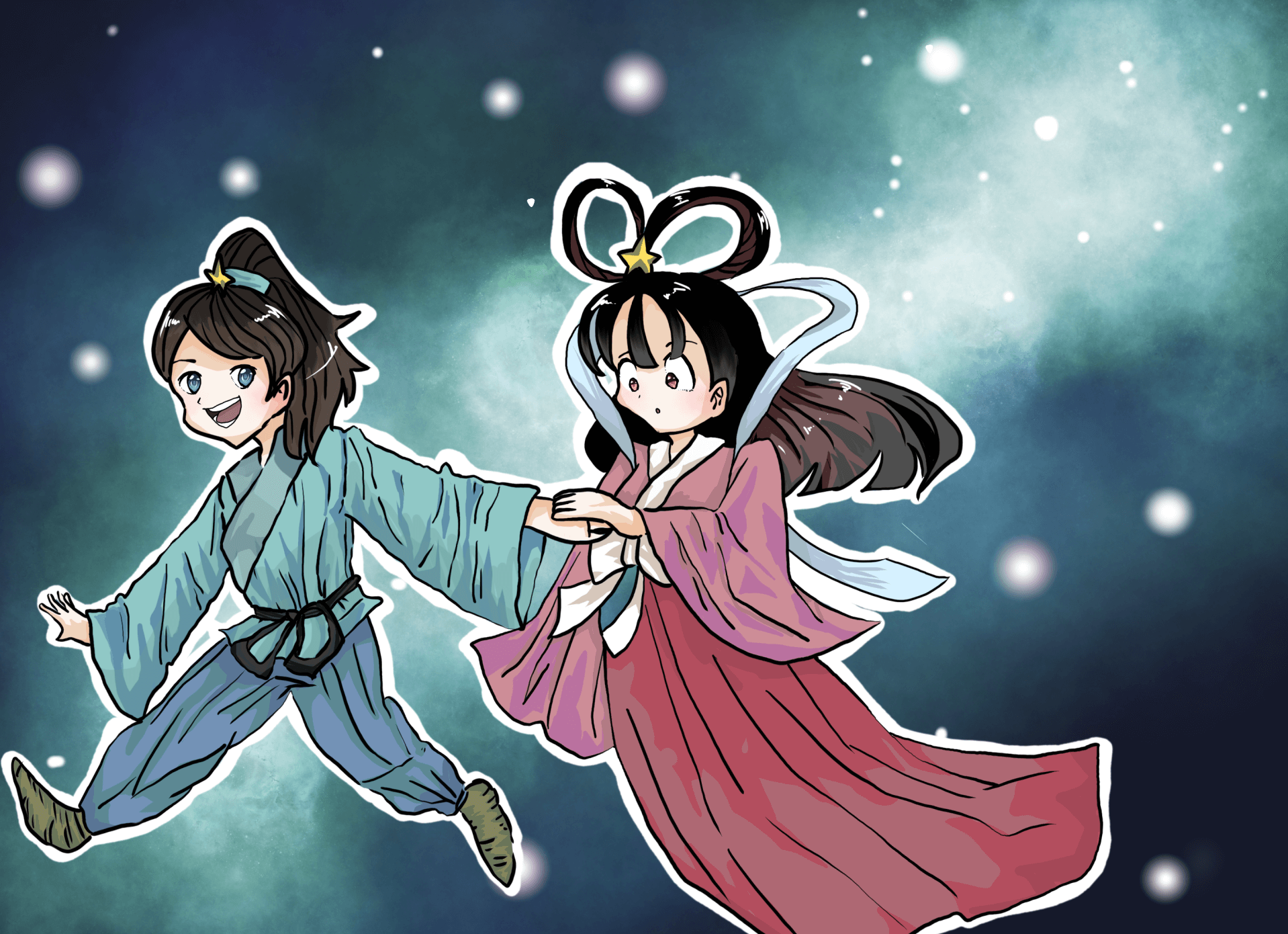 織姫と彦星がたのしく遊んでいるところを描きました。