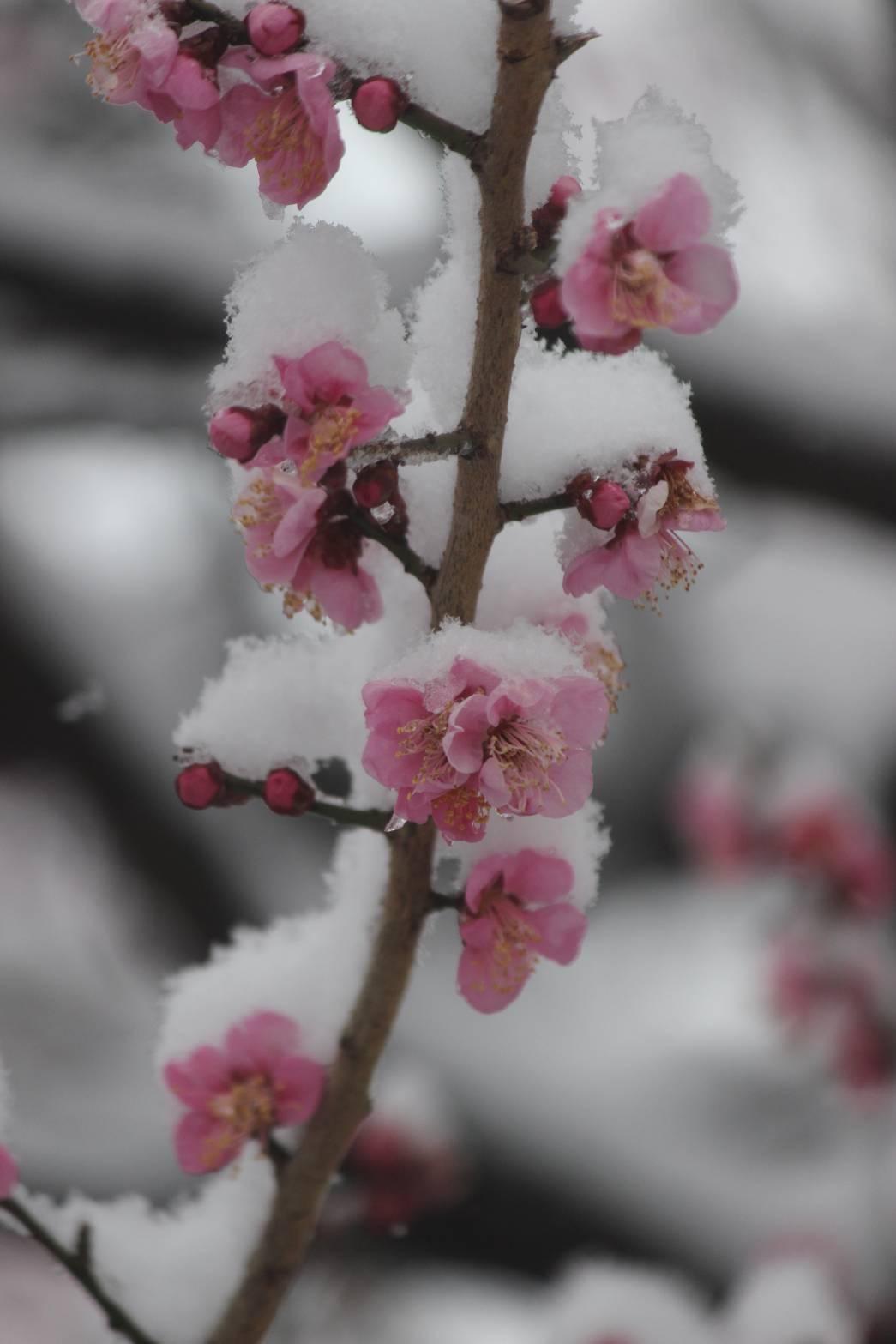 東京での大雪! 頑張って咲いた梅に重い雪! ピンクと白が日本の国旗みたいで可愛い!