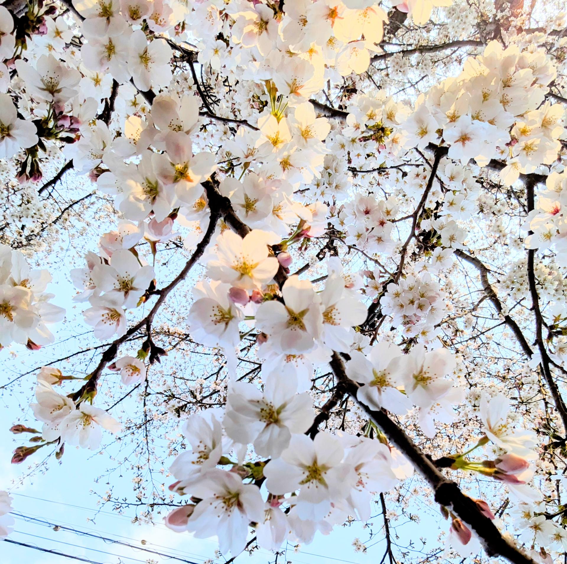花の重みで地面スレスレまで垂れ下がった桜🌸を真下からスマートフォンの内カメラで撮った写真下から上までの奥行きがでて良い感じに撮れたと思います