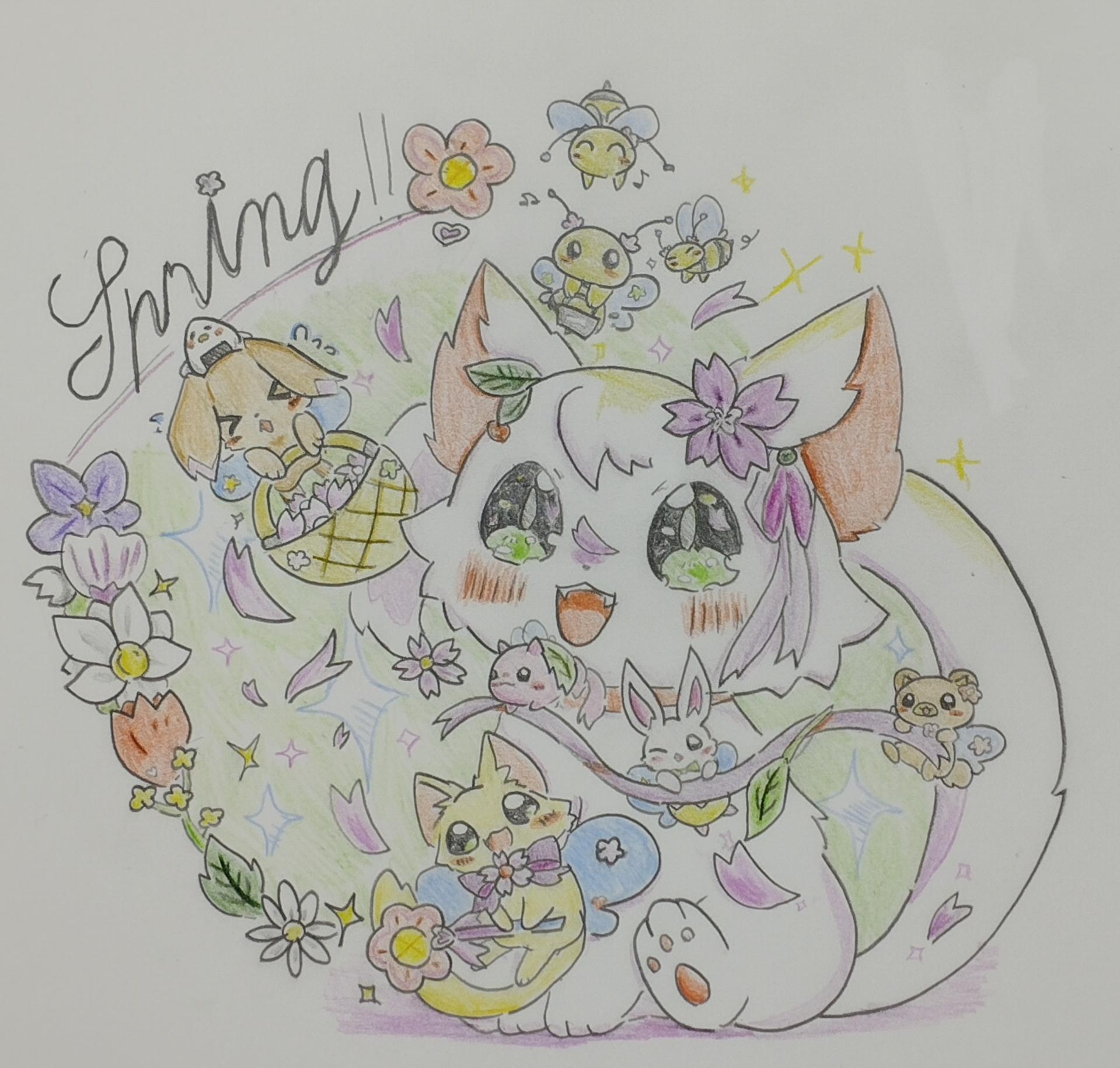 白猫と春の妖精たちが、一緒に遊んでいる様子を描きました。ポイントは、白猫に光をつけるために、黄色で上の方を塗ったところと、妖精が咲かせた花をすべて春の花にして色とりどりにしたところです。