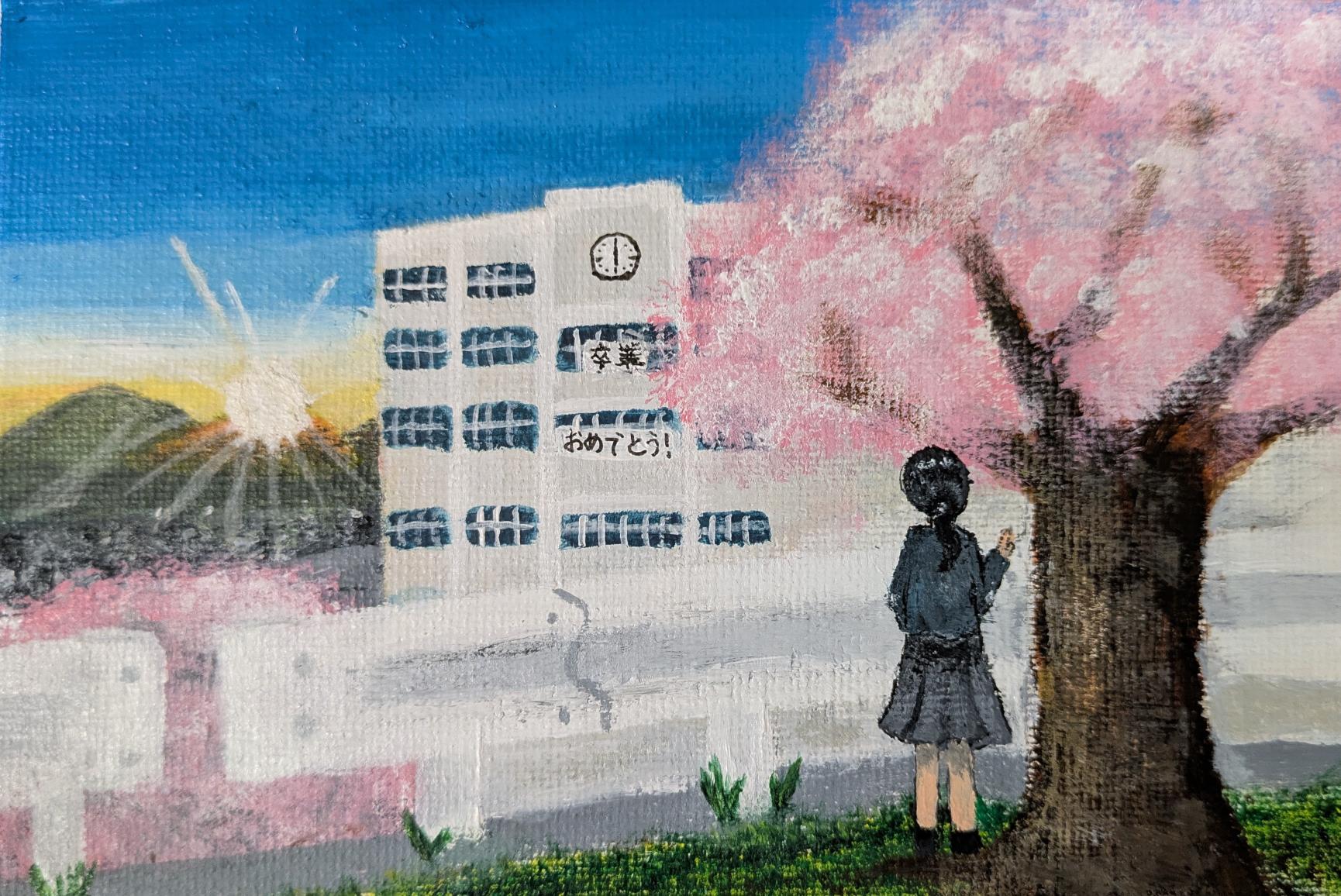 卒業した学校を眺めながら、楽しかった思い出に感謝しています。さあ、次はどんな出会いがあるかな。 今までへの感謝と、これからへのドキドキを込めて描きました。