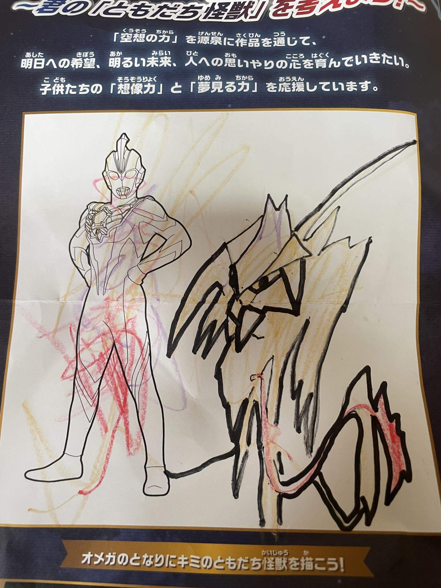 オメガのオーラから産まれた怪獣 鳥のような影のような姿 ピンチの時に守ってくれる 2歳の息子が描いた絵を母が縁取り目をつけました 名前は5歳の娘が考えてくれました