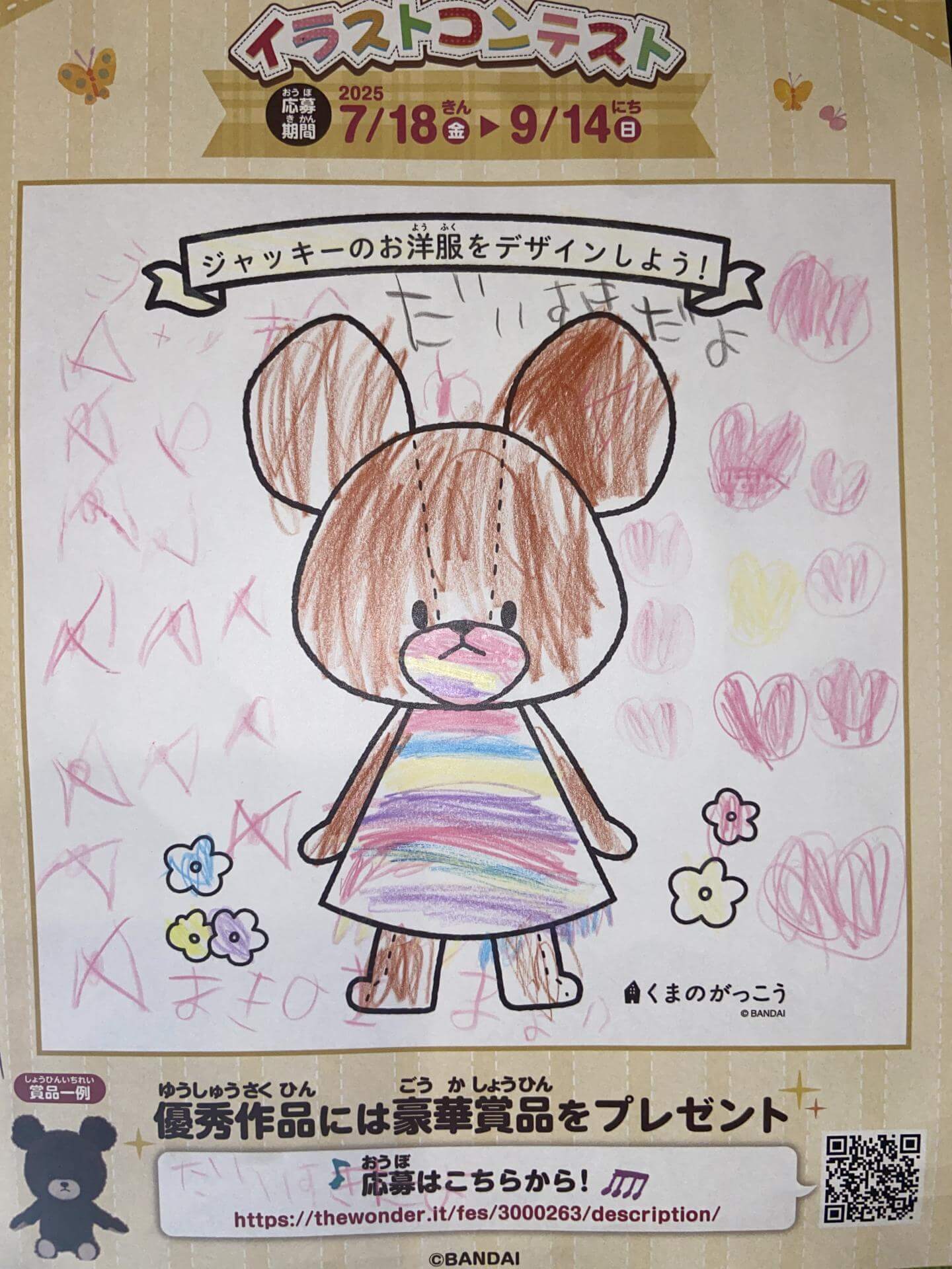 ジャッキーの絵本が大好きな5歳の娘。 ジャッキーに似合うようにとカラフルな色鉛筆を選んで、丁寧に、丁寧に塗りました。 ジャッキーのお口もワンピースとお揃いに塗りました。 周りもたくさんのハートとリボンで乙女チックな仕上がりになりました。 娘の自信作です!