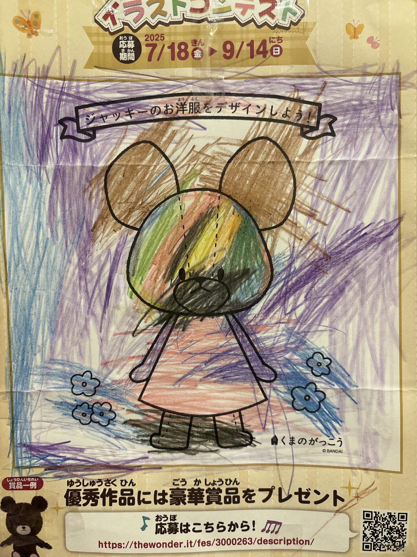 だいすきなむらさきで周りを塗ったよ! くまさんはにじいろでカラフルに! 塗り絵たのしかった!