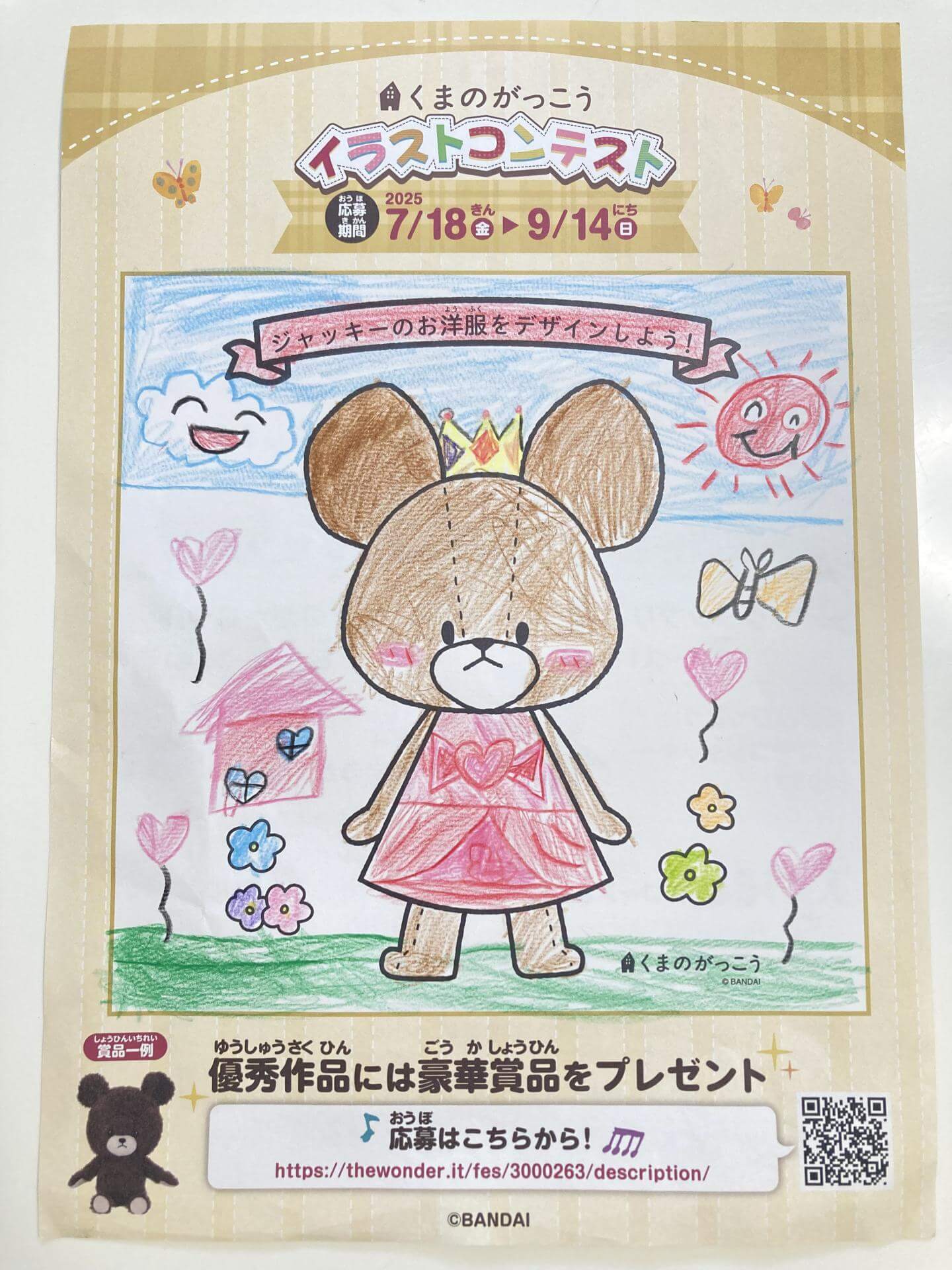 お洋服にピンクと赤の可愛いリボンをつけました。背景も可愛い雰囲氣になるようにイラストを書き足しました。
