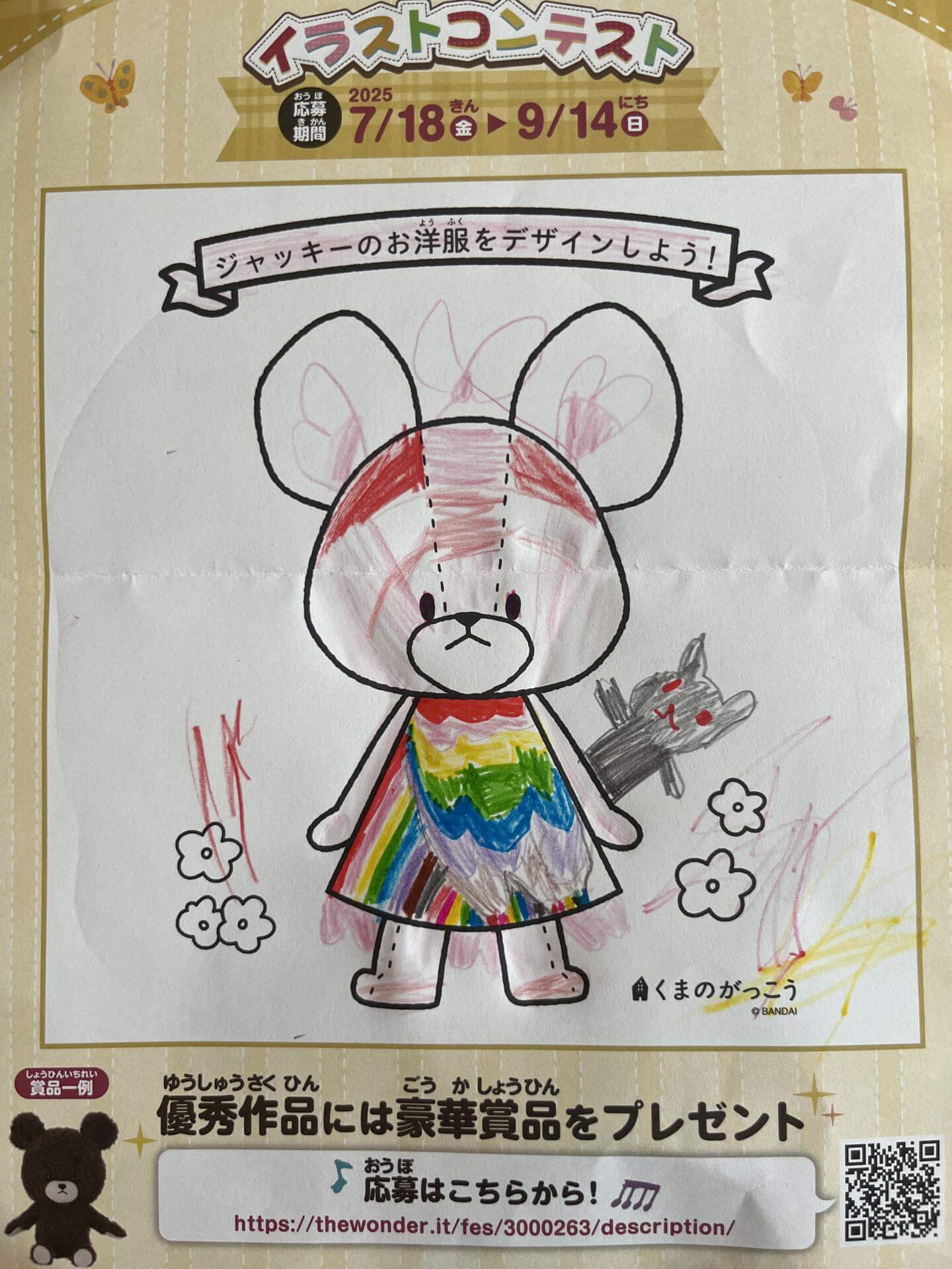 にじをテーマにつくりました。ゴージャスなワンピースと、リボンつきのぼうしがポイントです。ジャッキーはリボンがすきだとおもいます。ぬいぐるみのもこもこジャッキーもかきました。
