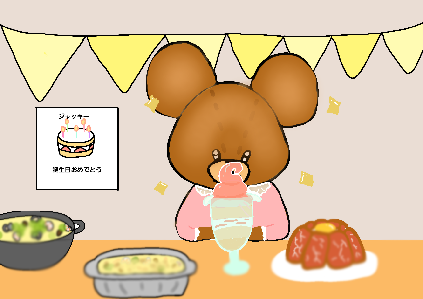 ジャッキー宛てにお兄ちゃん達から、パーティーの招待状がきてた。その場所に行ってみるとなんとディナーがたくさん!ジャッキーは、「よーしいっぱい食べるぞー」と大喜び♪11人のお兄ちゃんも、大満足