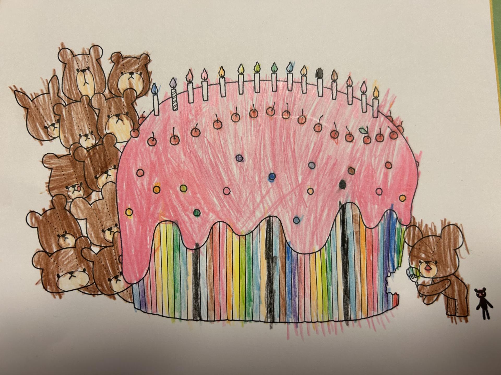 ジャッキーのバースデーケーキを色々な色のケーキにしました。上はイチゴ味のクリームが乗ってます。