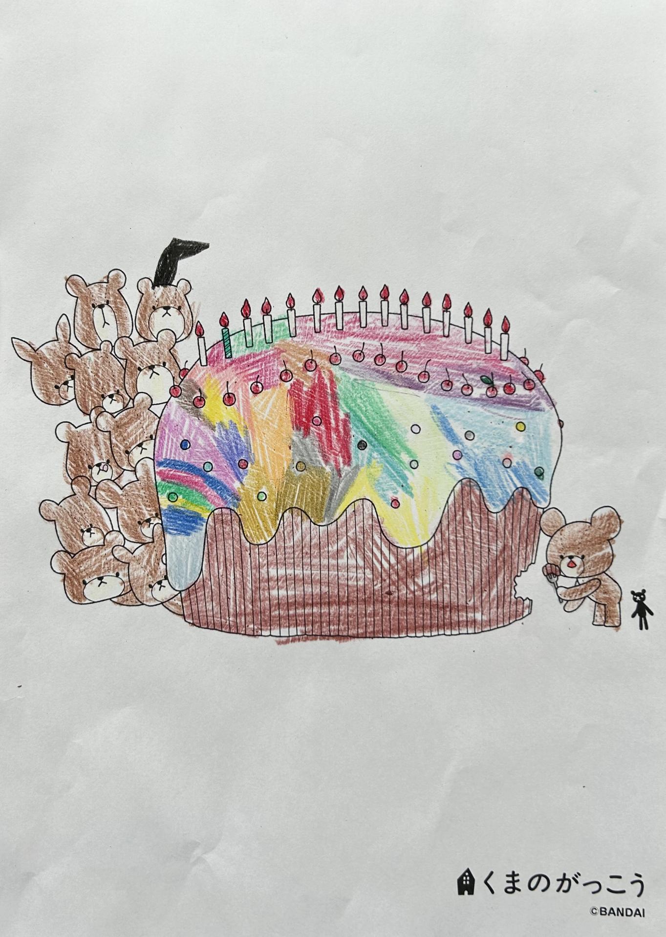 ろうそくは小さくて大変だったけど、細かいところまで頑張って塗った。おいしそうに見えるように、カラフルに塗ったよ。せかいでいちばんおいしいケーキができた!
