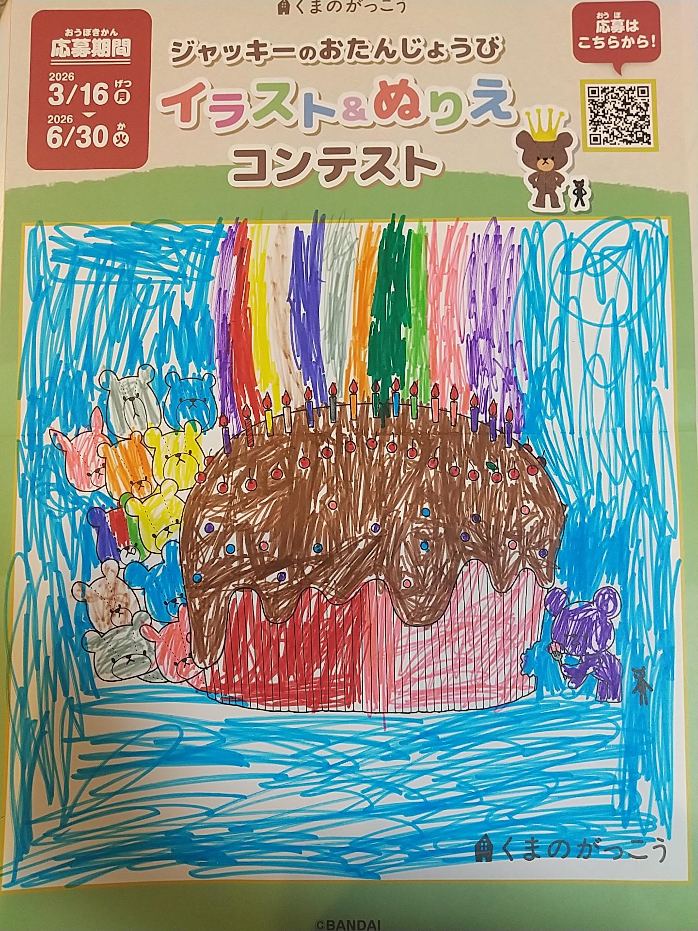 カラフルなくまさんたちが作った苺チョコケーキ!色とりどりのろうそくに火を灯すと、なんと、ろうそくからにじが現れました!ジャッキーのにじいろ誕生日会のはじまりはじまり~!