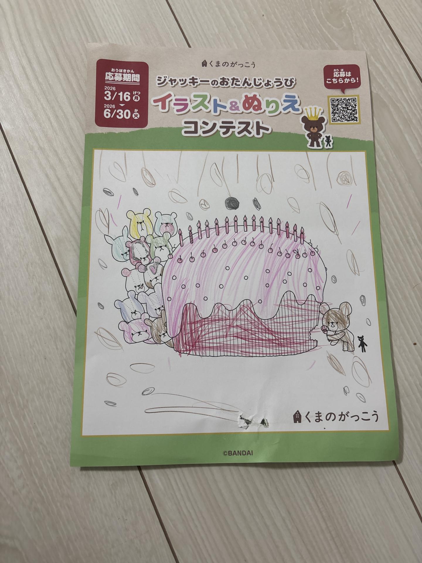 茶色のくまちゃんがカラフルなくまちゃんたちのお誕生日ケーキをつまみ食いしてるそうです