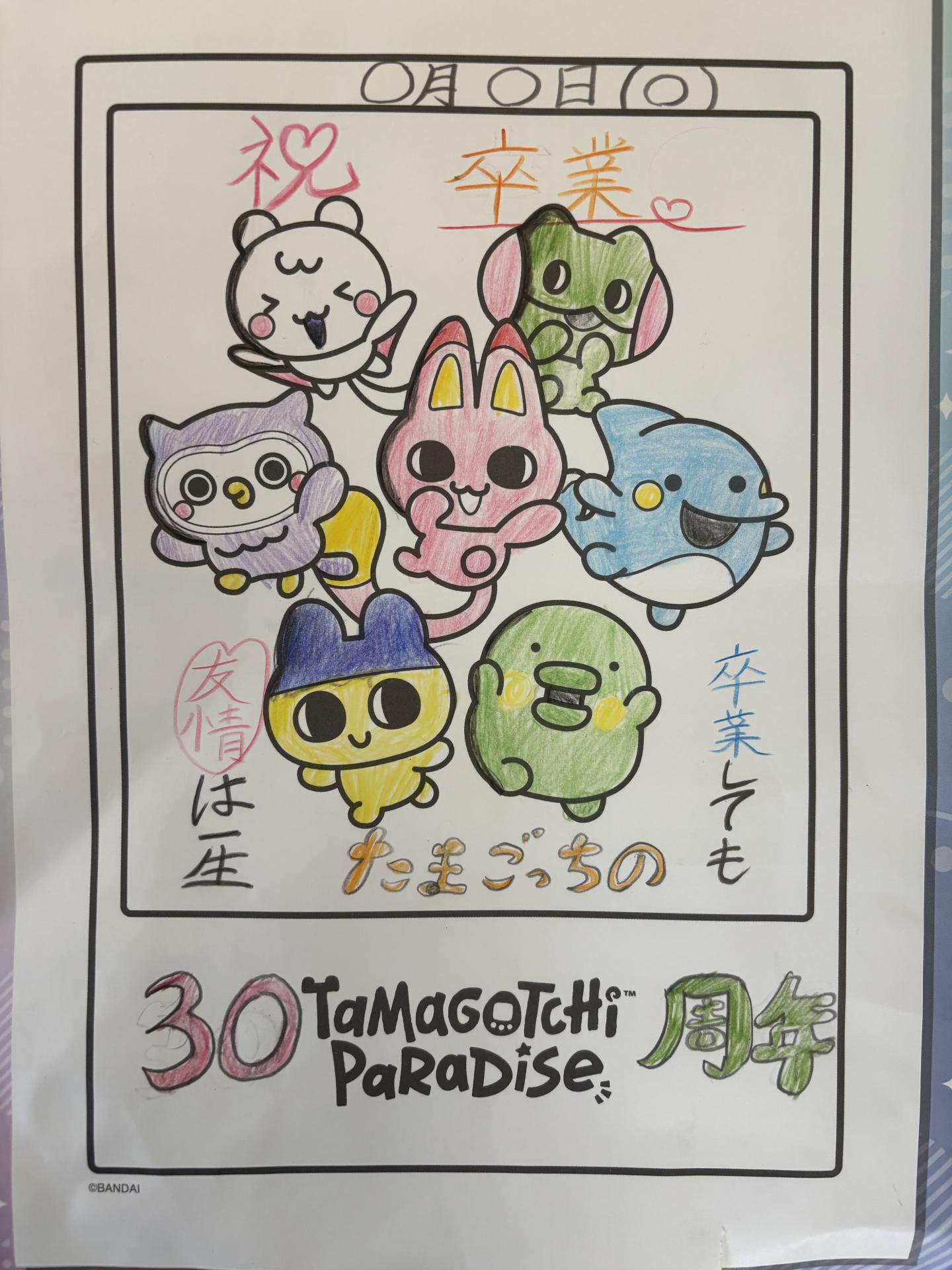 3月にちなんで卒業とたまごっち30周年をお祝いしようの会にした。プリクラ風にした。