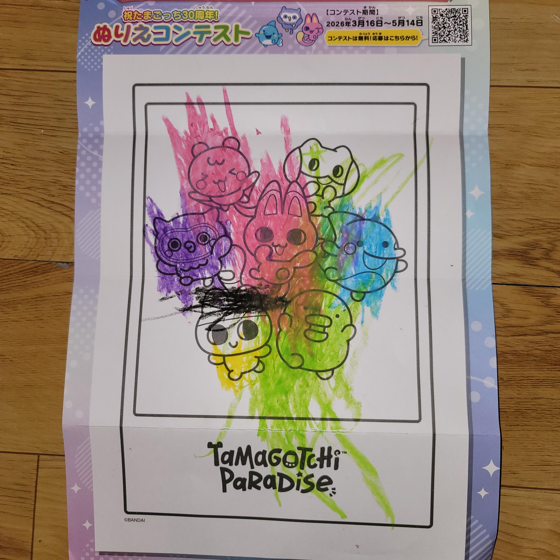 3歳の娘がげんきいっぱい塗り絵しました! たまごっちのキャラクター、 まめっちがとくにだいすきな娘です!