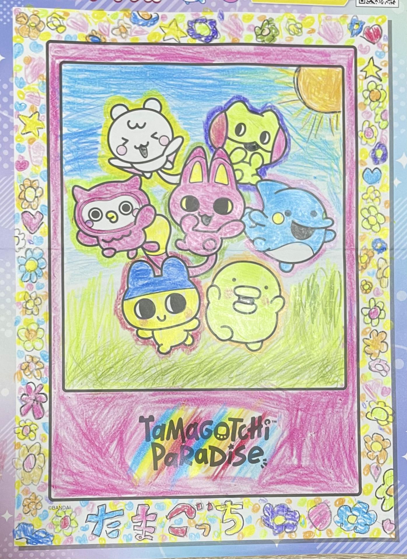 まわりにたくさんのお花をさかせて、みんなで楽しく遊んでるようすを描いたよ!