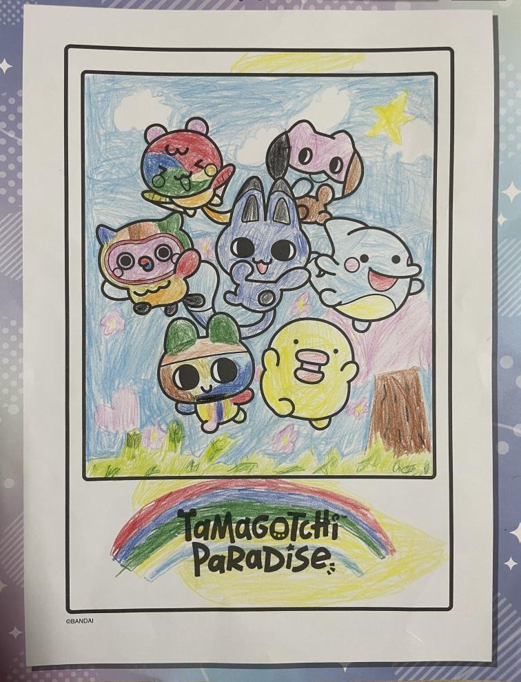 もうすぐ春なので桜をかきました。 ぼくはたまごっちがすきです。いろんな色でぬりました。