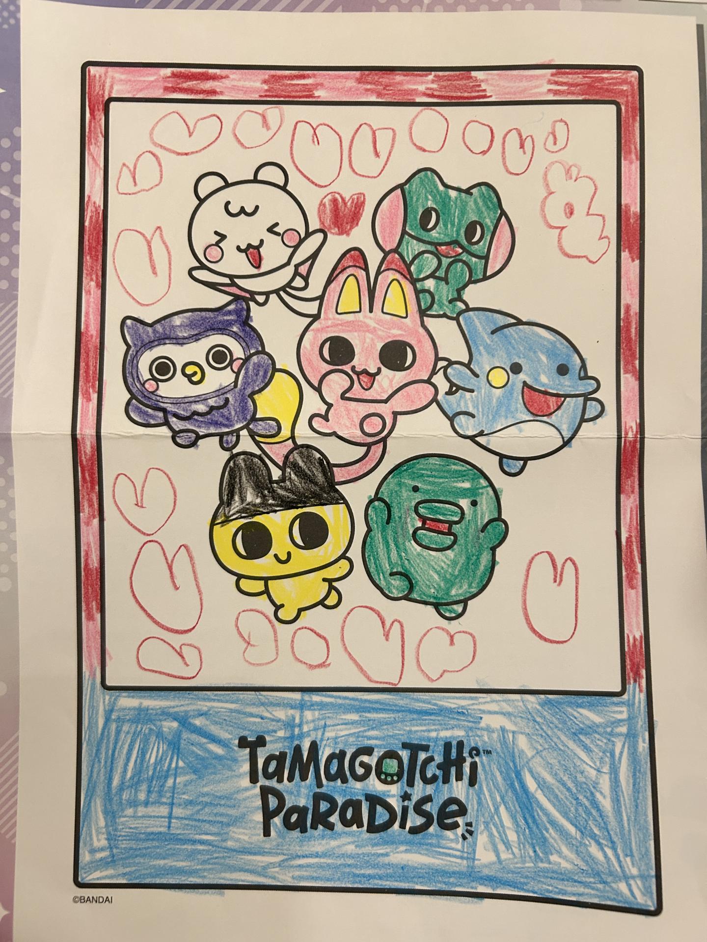だいすきなたまごっちのキャラクターに赤とピンクで囲って、中にもハートをいっぱい書いて可愛くしました。