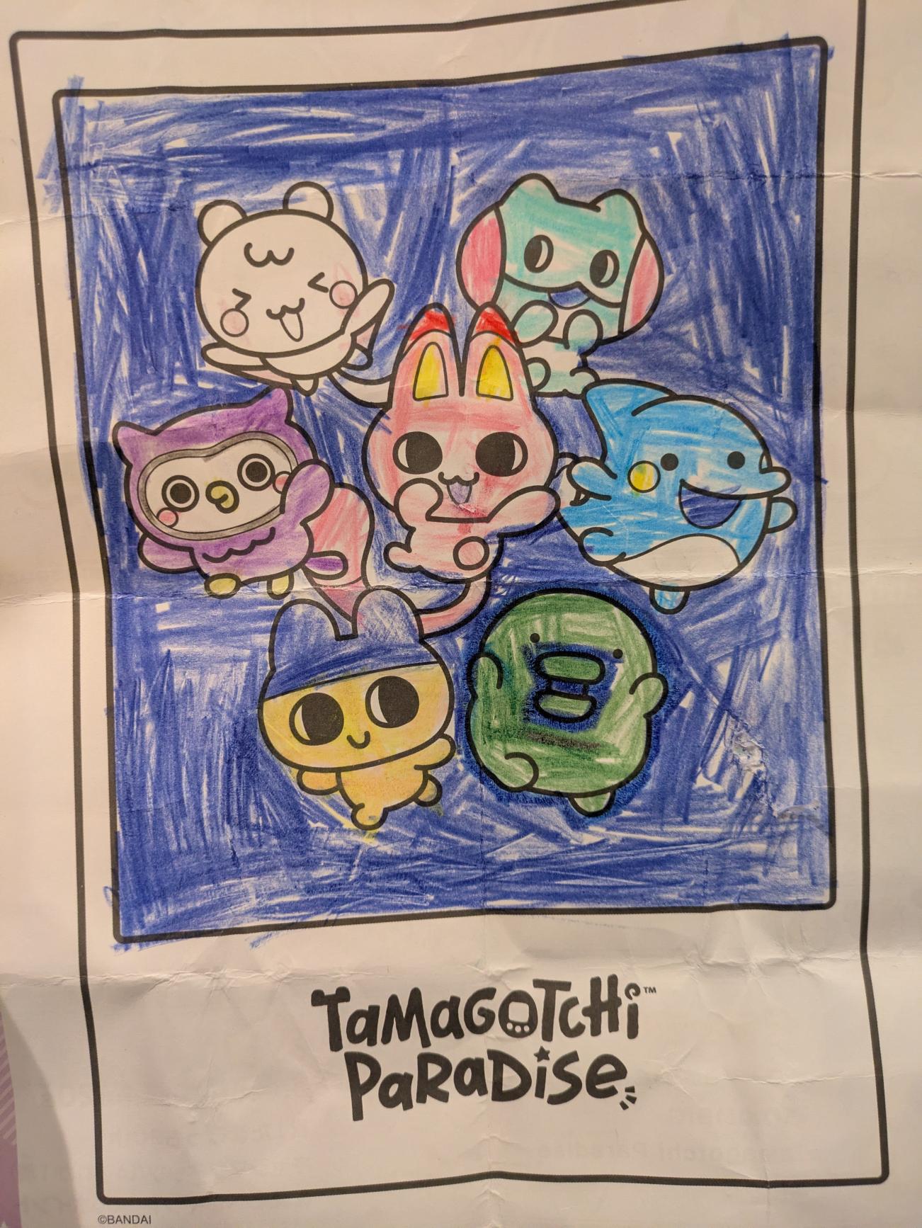 見本のたまごっち達にあう色鉛筆を選んでぬりえしたよ! カラフルに塗れたから「かめれおん」みたいと思ったよ!