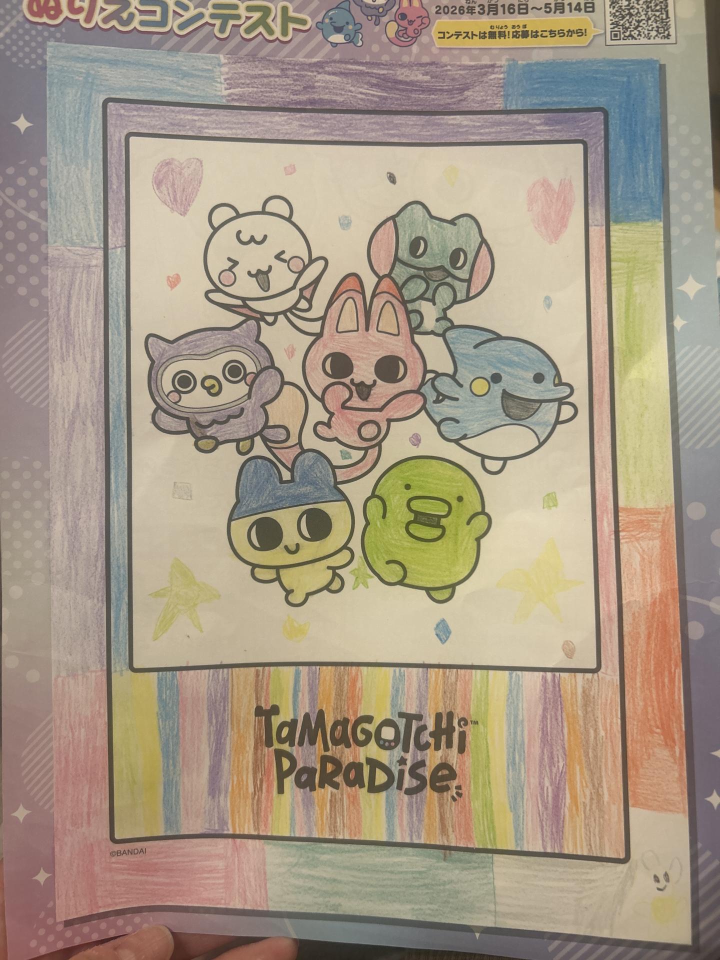 まわりに色をつけてレインボーにしました。 星やハート、ダイヤなど色々な形も書きました。 まめっちとみゃおっちが好きなのではみ出さずに綺麗に塗りました。