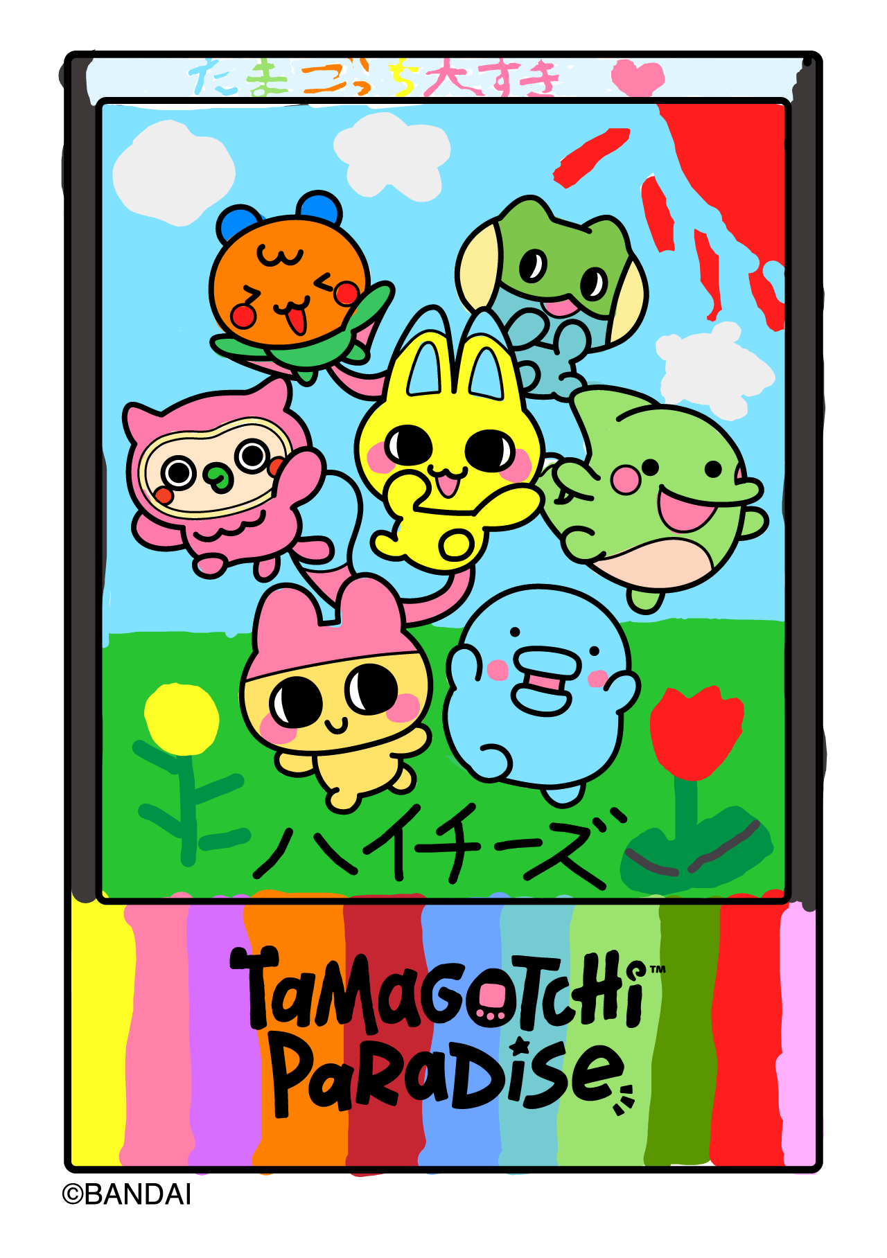 青空の下でみんなで仲良く楽しく遊んでいるところを記念撮影!たまごっちの色を変えているところがポイント!