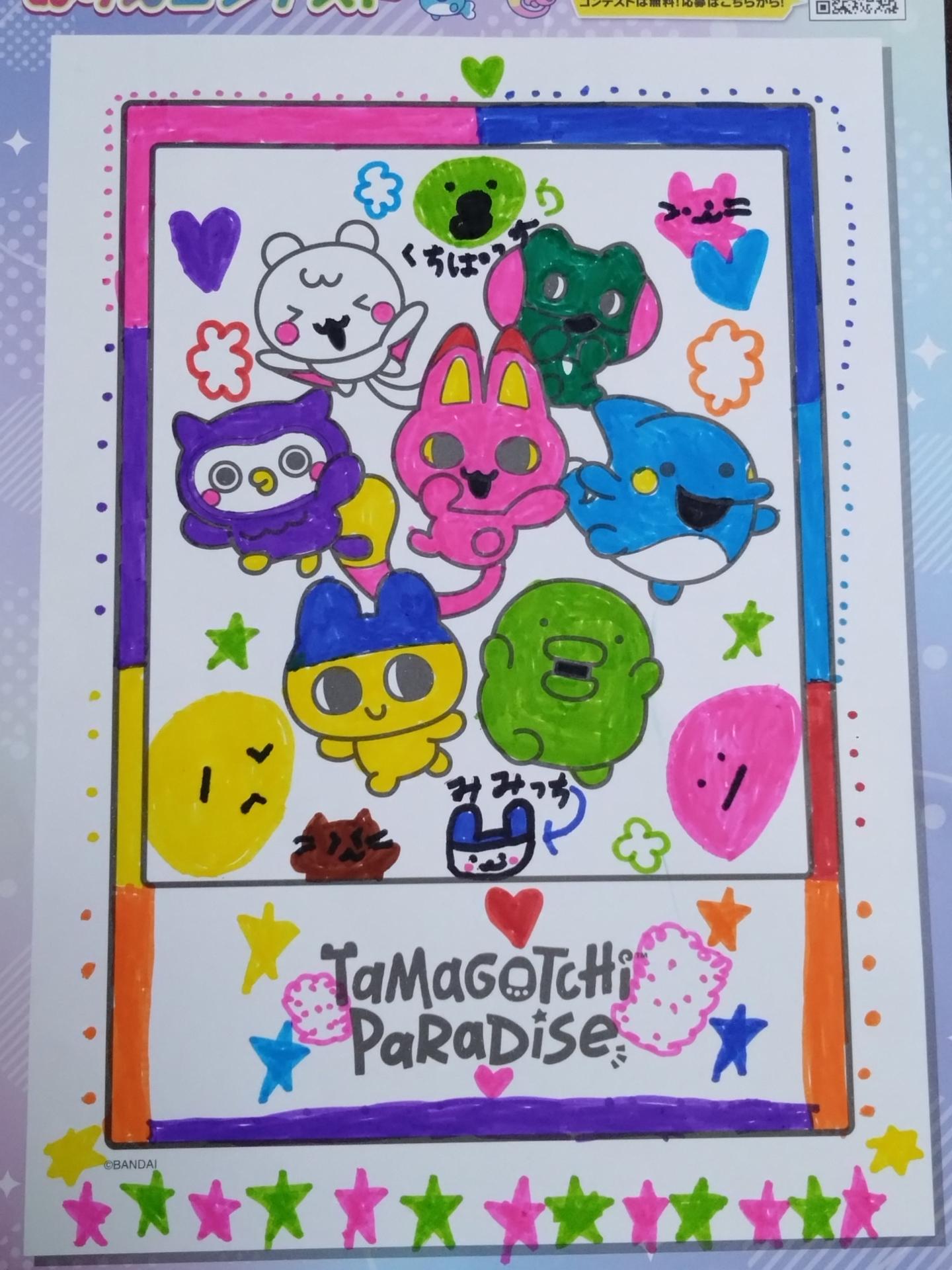 たまごっちが自分の夢に出てきたらこんな感じかな?とイメージして描きました。 ぬり絵にはいないみみっちやくちぱっちも描き足してみんなでワイワイ楽しく過ごしている様子です。