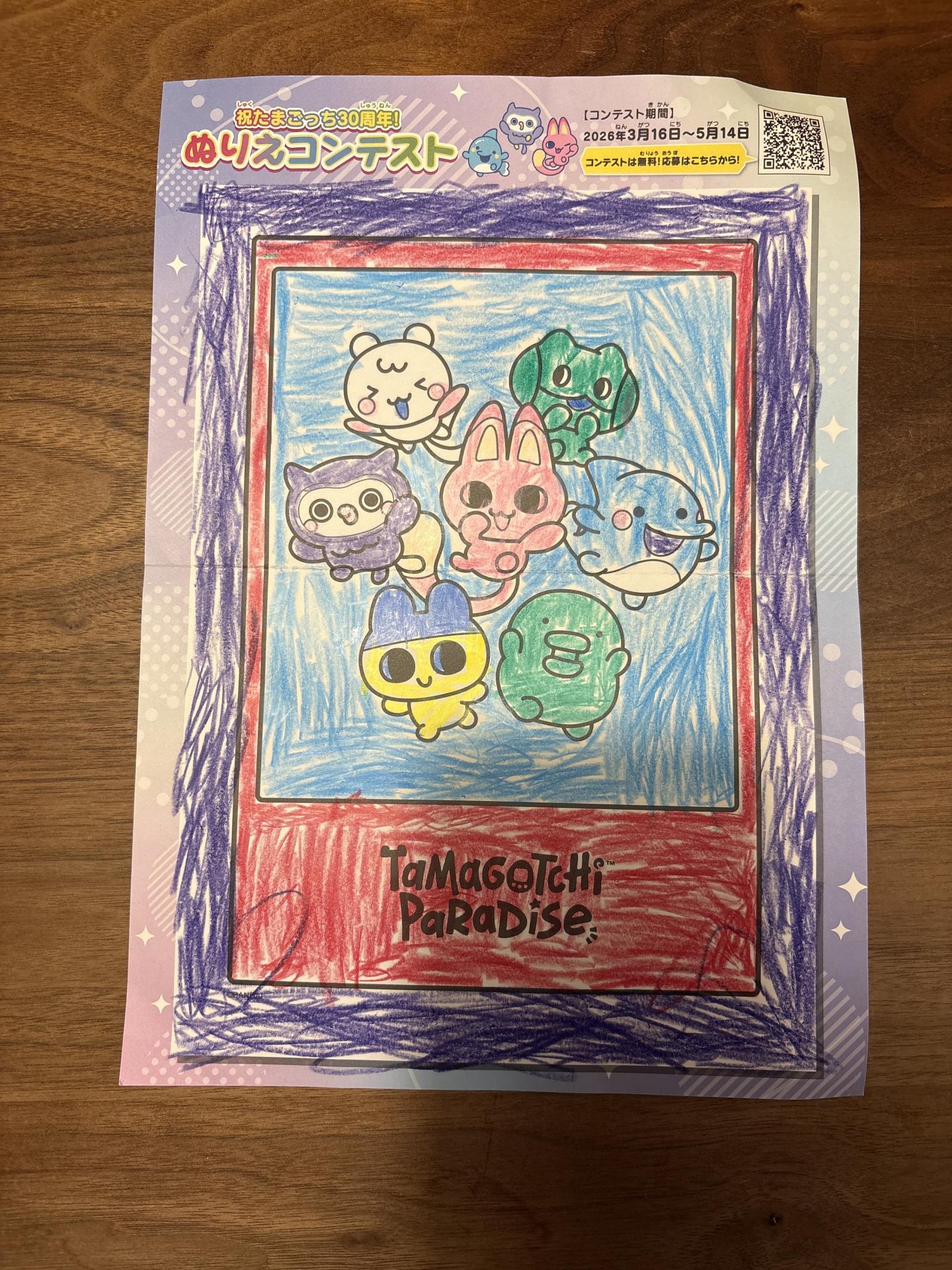 大好きなたまごっちの塗り絵コンテストに応募できてうれしいです。 夢の中に出てきたキャラクターたちを想像して塗りました。