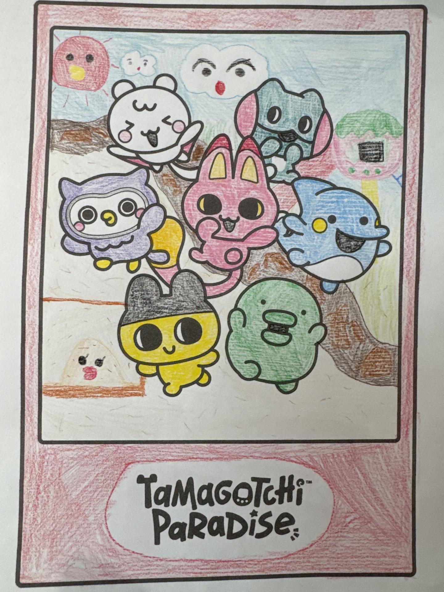 かわいいたまごっちたちが公園で遊んでいるところを描きました。太陽や砂場がたまごっちっぽいところもポイントです!