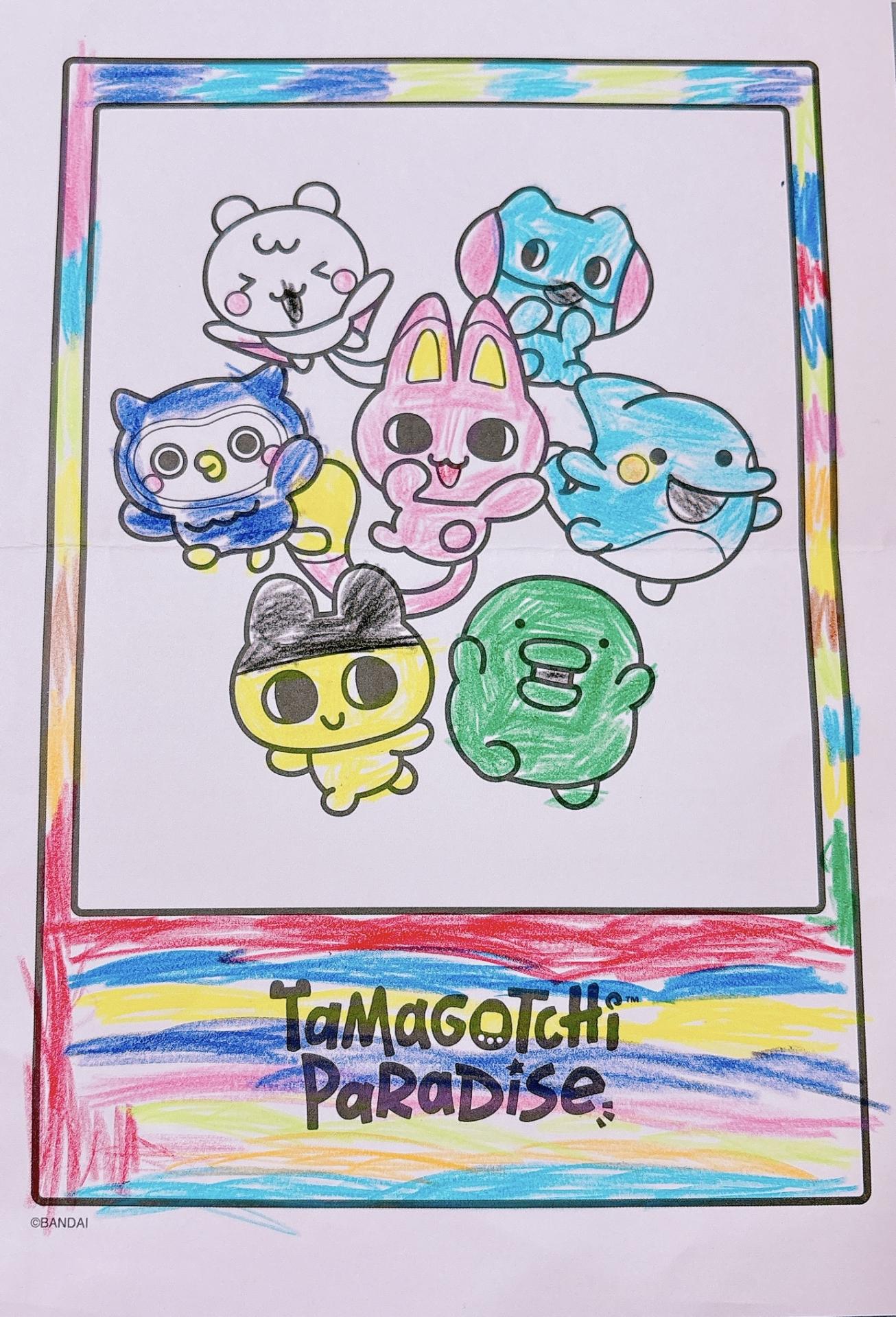 全部のたまごっちを丁寧に塗り、全体的に明るくなるように名前のところは虹色にしました🌈このぬりえは、わたしたちは可愛いたまごっちー!と言って写真を撮っているところです。