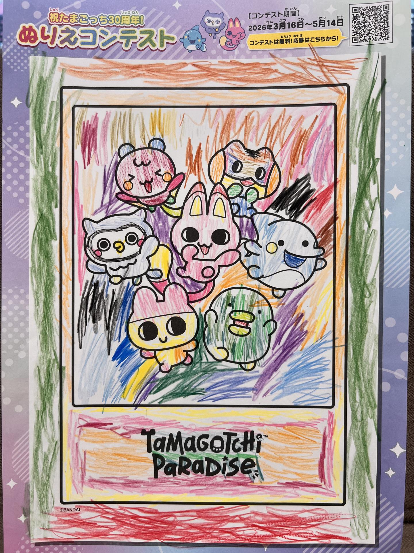 タイトルは「可愛いお名前やろ?だって面白いお名前がええやん」とのことです。くちぱっちの緑を塗り分けていることや、背景をカラフルにしているのがポイントだそうです。お手本がない子は思い出したり、想像して塗りました。1時間以上、色を迷いながら塗りました。「塗るとこ残しておく」と、かわずっちだけ塗っていなかったのでコンテストのことを教えると「じゃあ塗る。入賞するわ、分かる」と自信満々な様子でした。母代筆