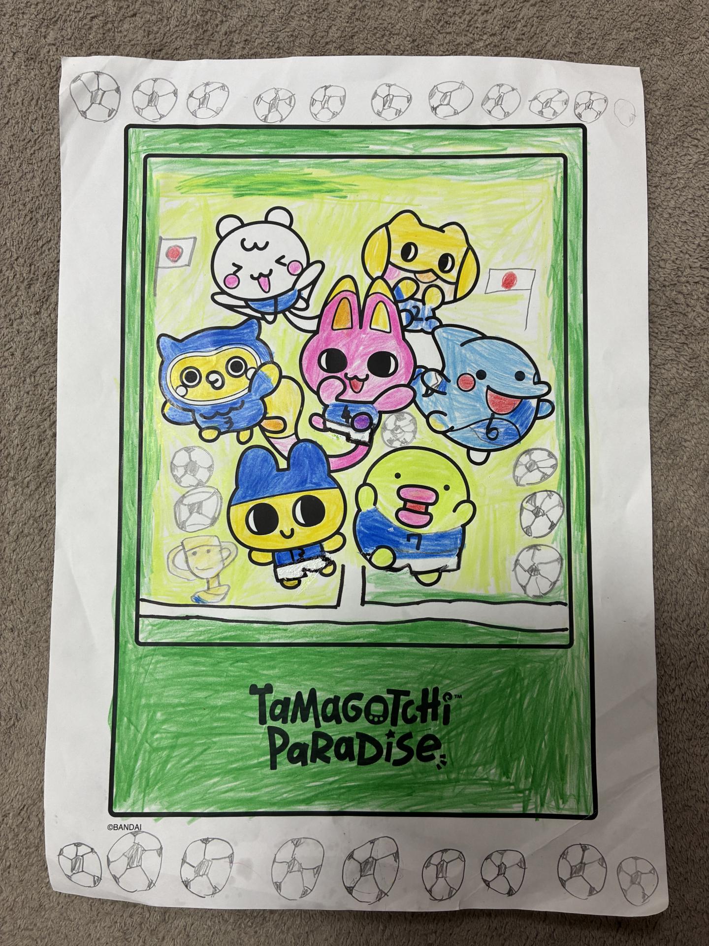 今年は4年に一度のワールドカップがあります。ぼくはサッカーが大好きなのでたまごっち達も日本代表選手のように変身させました。サッカーボールもたくさん書きました。1番難しかったのはユニフォームのズボンです。
