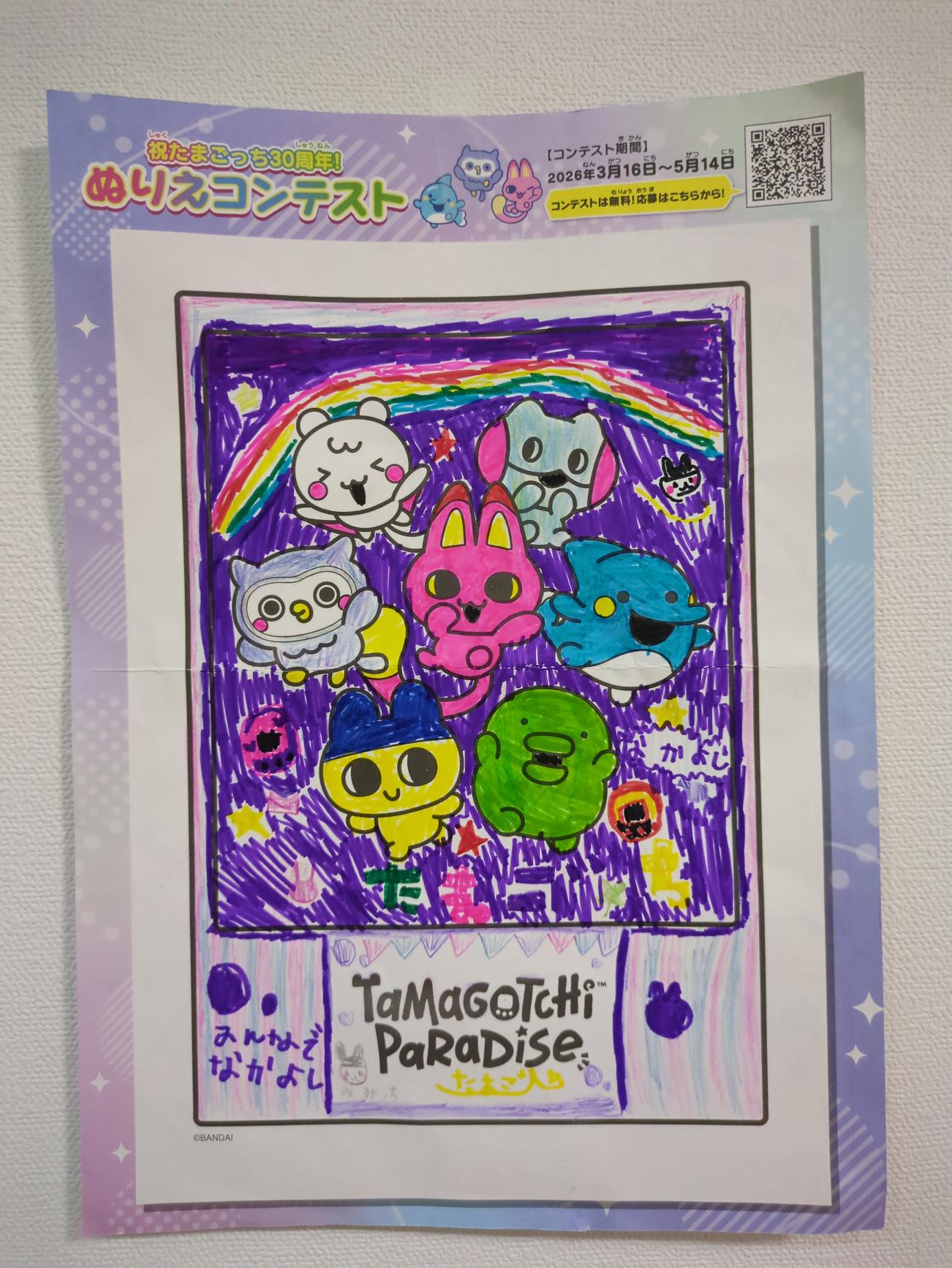 なかよしなたまごっち達が、夜空の中をお散歩しているところを描きました。楽しい様子をカラフルに描いています。小さいみみっちや、たまごっち本体も描いたところがお気に入りです。たくさんのお友達に見てもらえると嬉しいです。