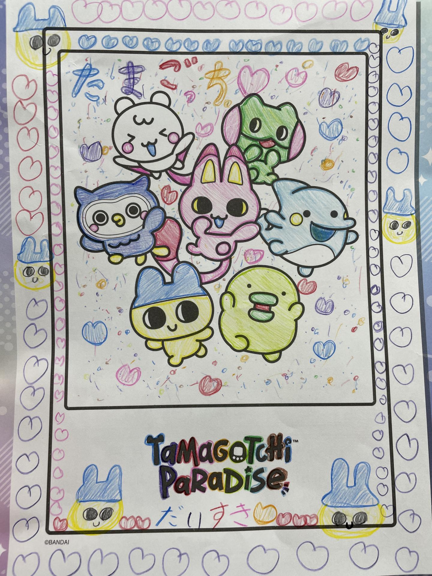 お母さんがたまごっちをまだ買ってくれていないんですが、いつかたまごっちを買ってくれた時のためにキャラクターは調べていくつも覚えました。この塗り絵はクラッカーを周りにしてだいすきなたまごっちを表そうと思いました。