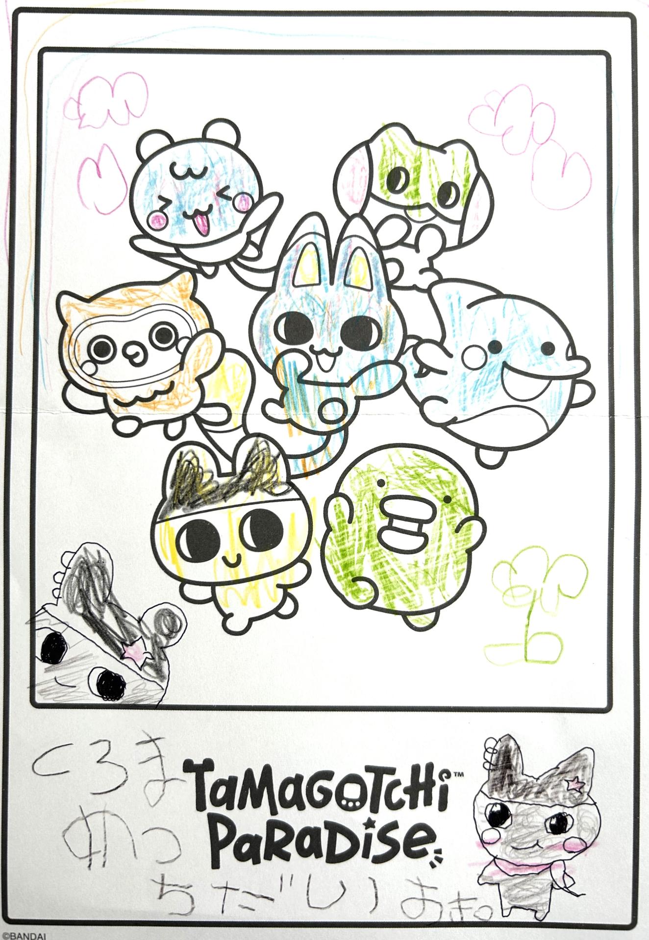 くろまめっちがすきなので、ままにかいてもらったくろまめっちにぬったいろがポイントです。 にじとぴんくのくももかんがえました。
