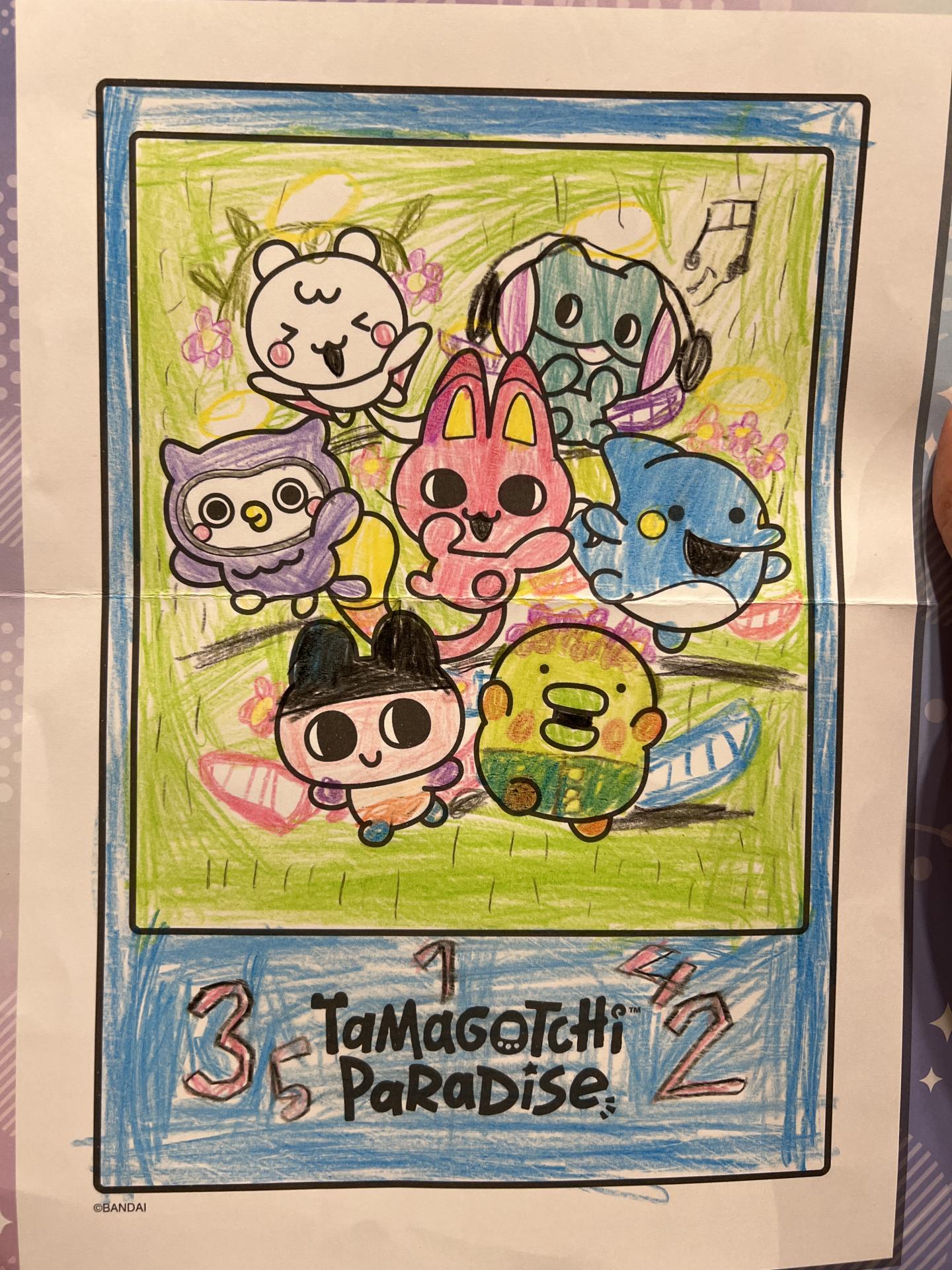 絵の周りは初代たまごっち風に再現してみました。 たまごっちのキャラクターたちも楽しそうに 見えるように色々かきたしてカラフルに してみました!塗ってるあいだも楽しかったです。