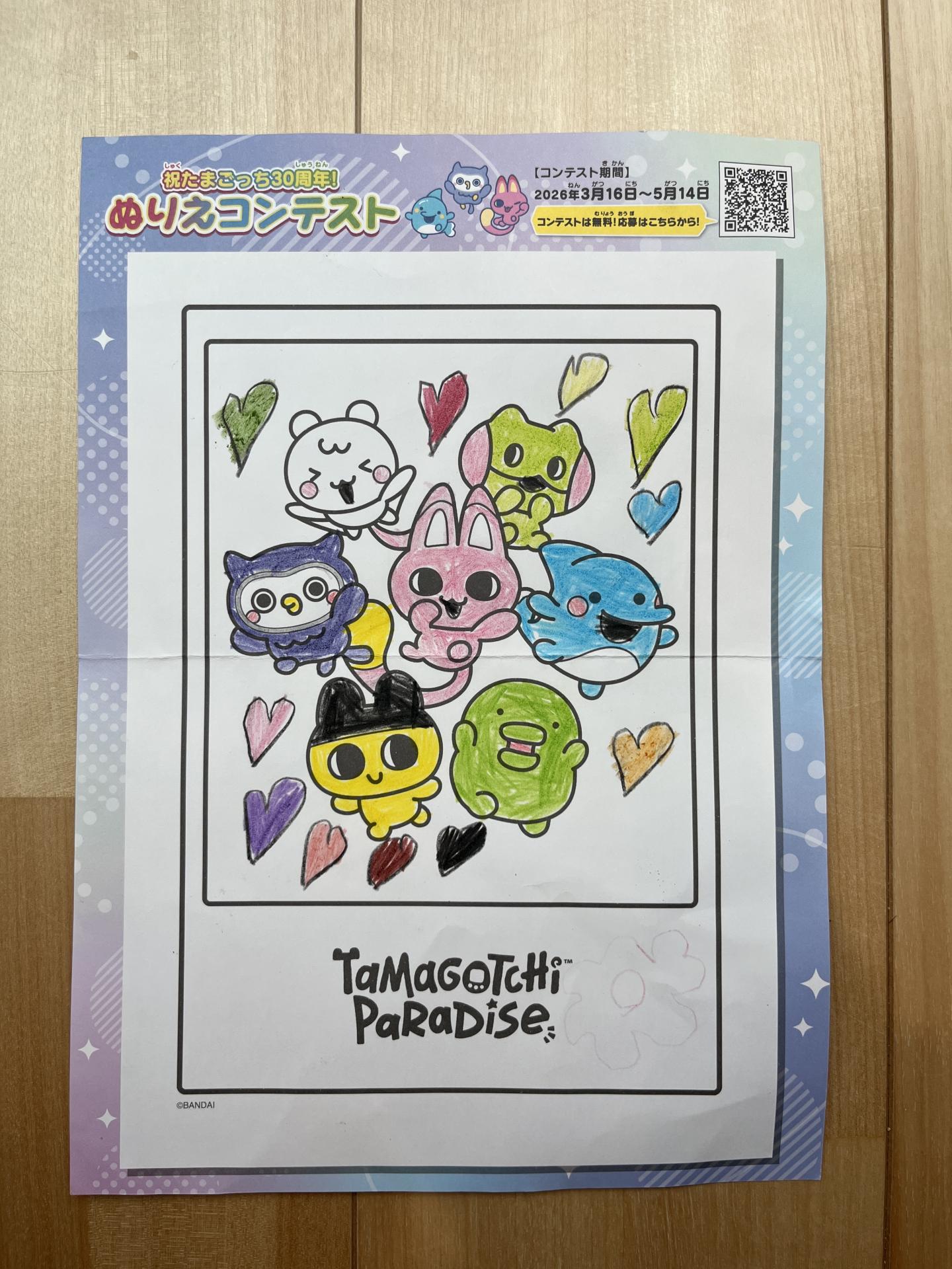 だいすきなたまごっちとハートをたくさん描きました!見たお友達がカラフルで楽しい気持ちになると嬉しいです。