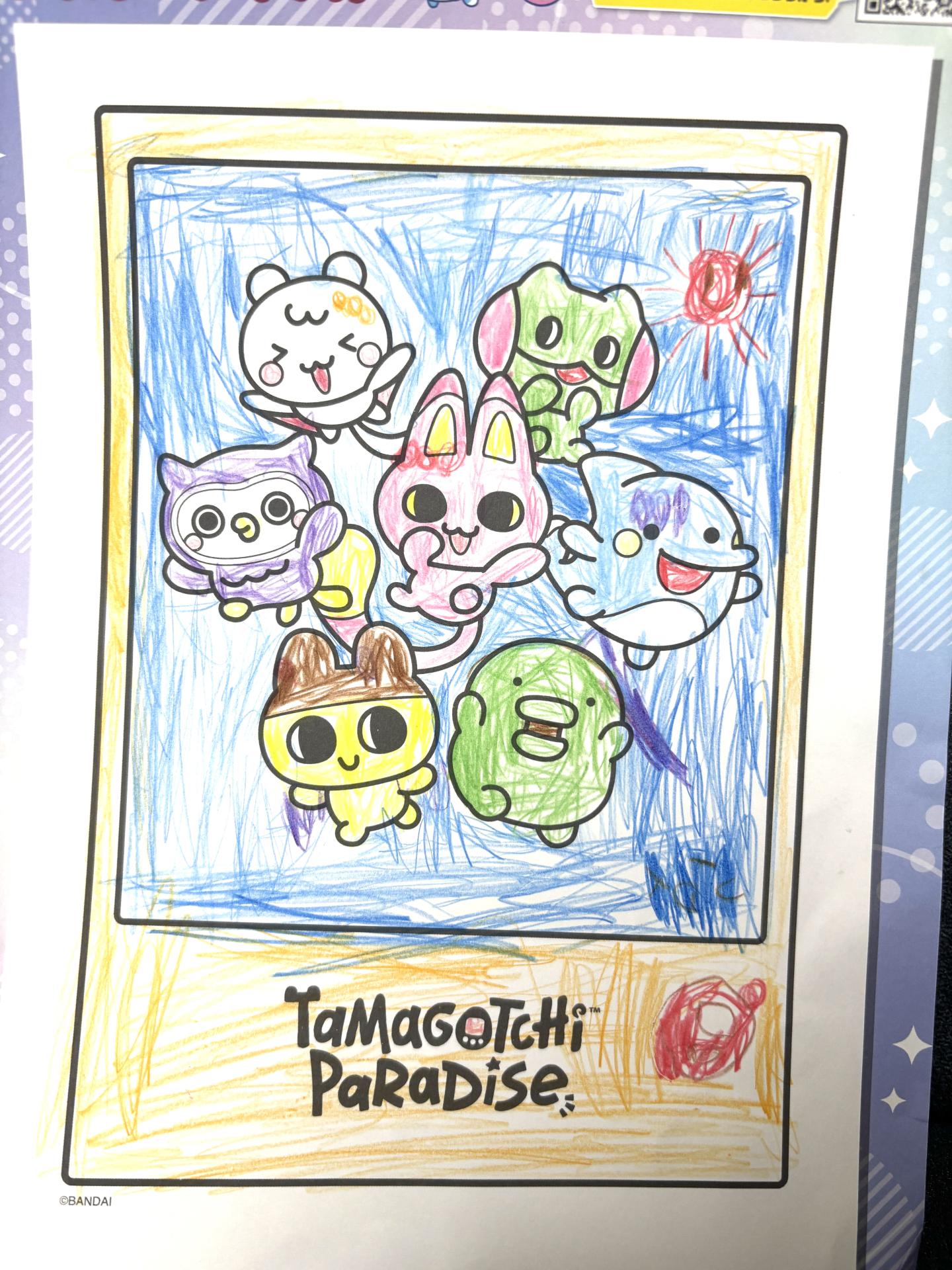 みゃおっちをぬるのをがんばりました。 もんがっちとみゃおっち、いるかっちにリボンをつけました。 キャラクターのみんなが、おてんきの日に仲よく飛び出しています。 右下はたまごっちを描いてみました。