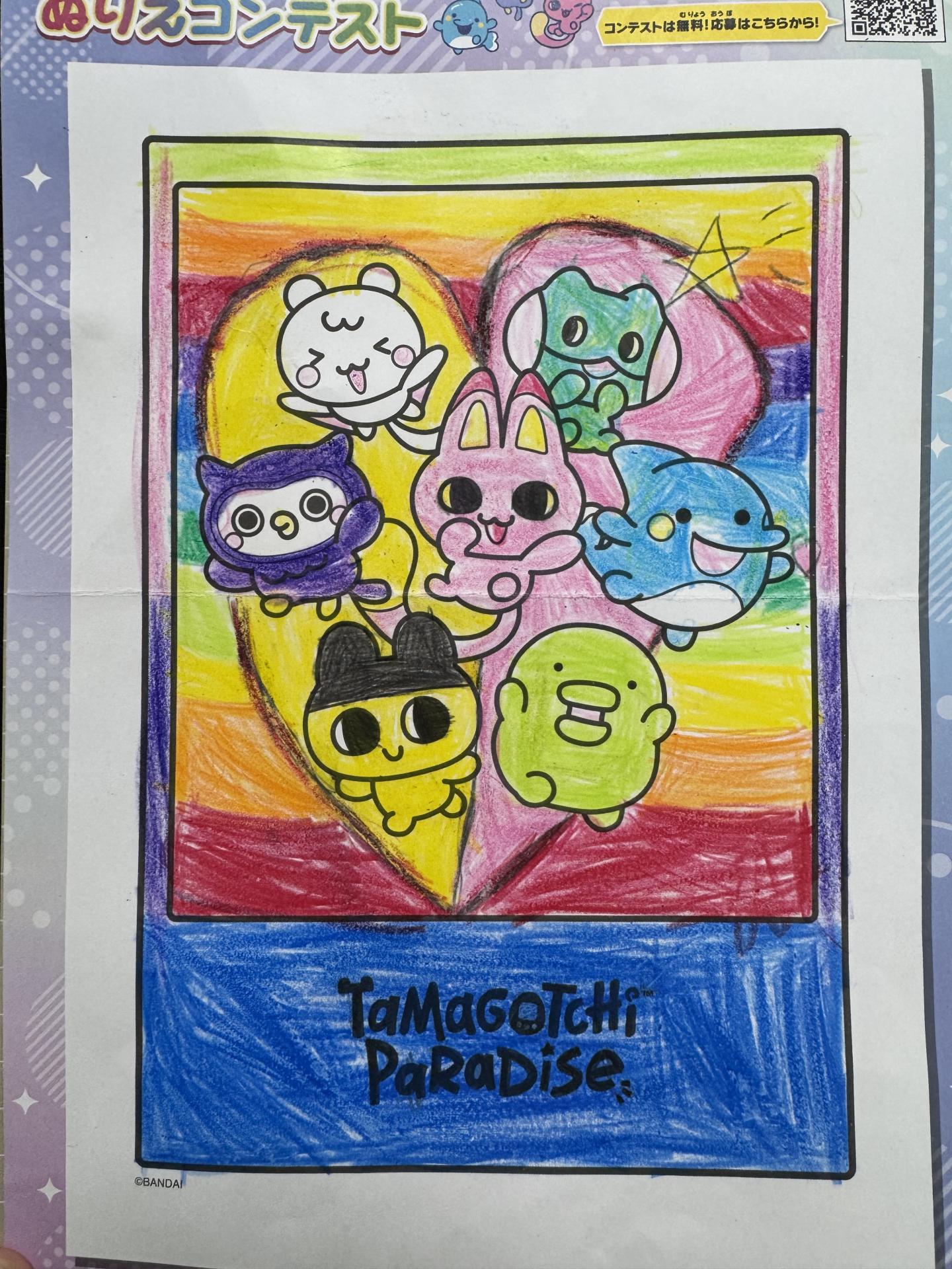 大好きなたまごっちのキャラクターが綺麗な虹と一緒に撮った写真をイメージして塗りました。