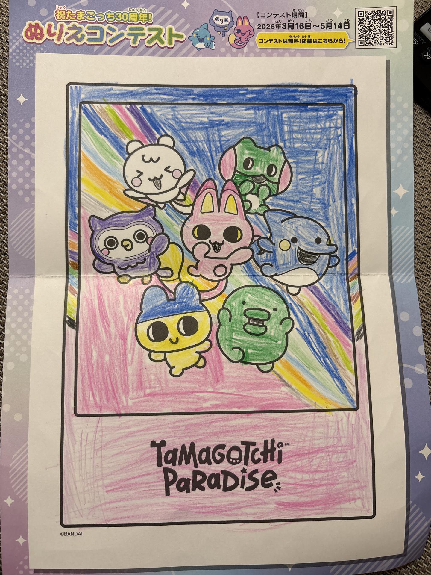虹の中からたまごっち達が飛び出してくるイメージで塗りました。