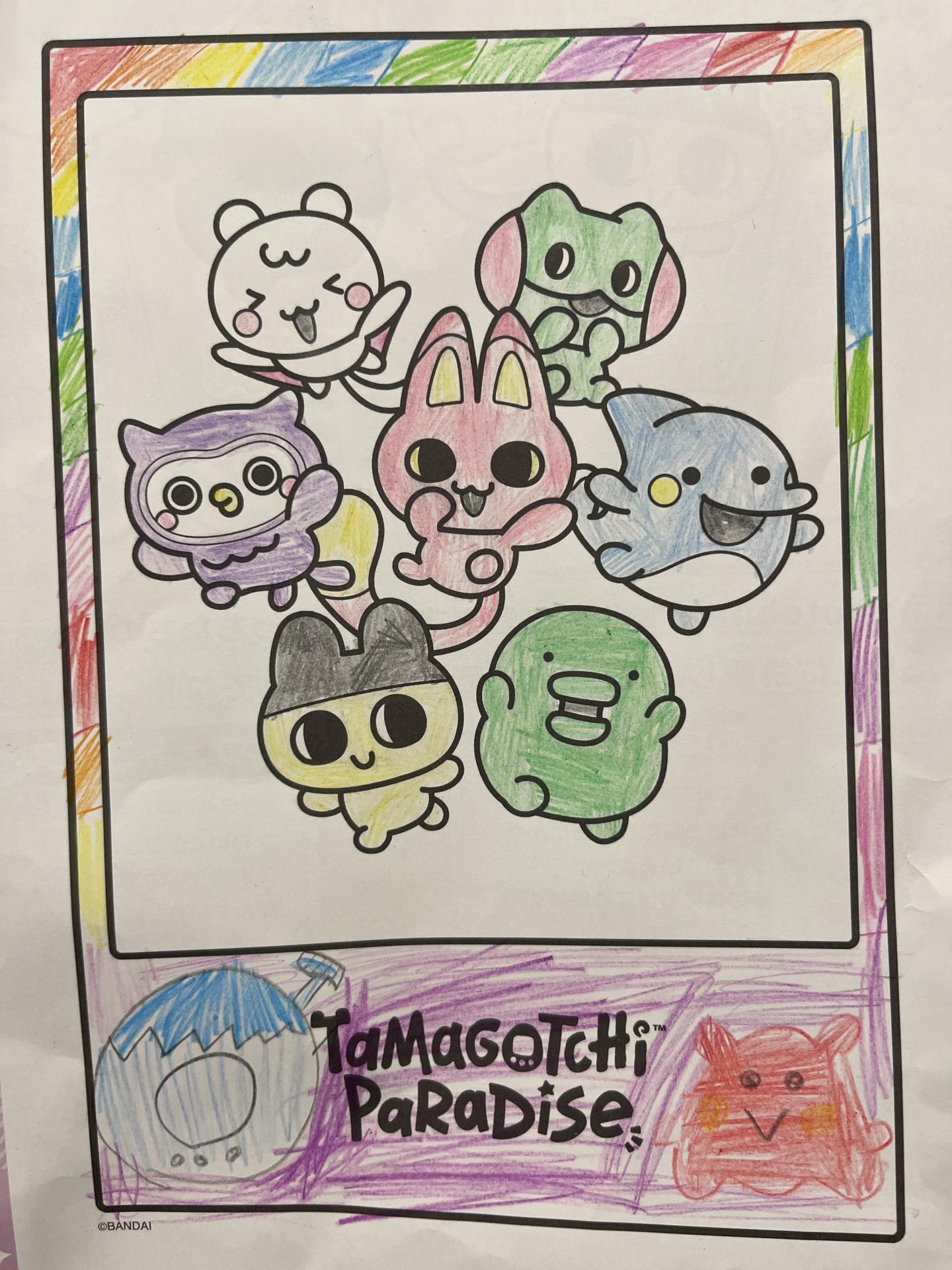 頑張って綺麗に塗りました。 たまごっちパラダイスをやっていて、めんだこっちになったのでめんだこっちも描きました。 まわりをカラフルにして可愛いくしてみました。