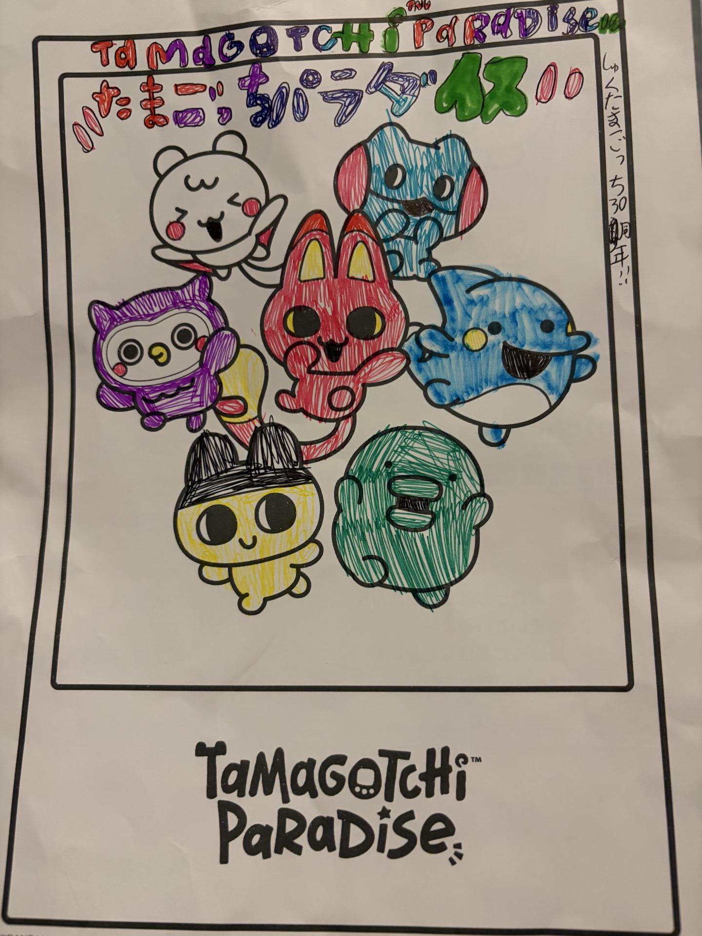 英語と、たまごっちパラダイスという文字を頑張って書きました。 ボールペンで色塗りをして、細かくて大変だったけど頑張りました。