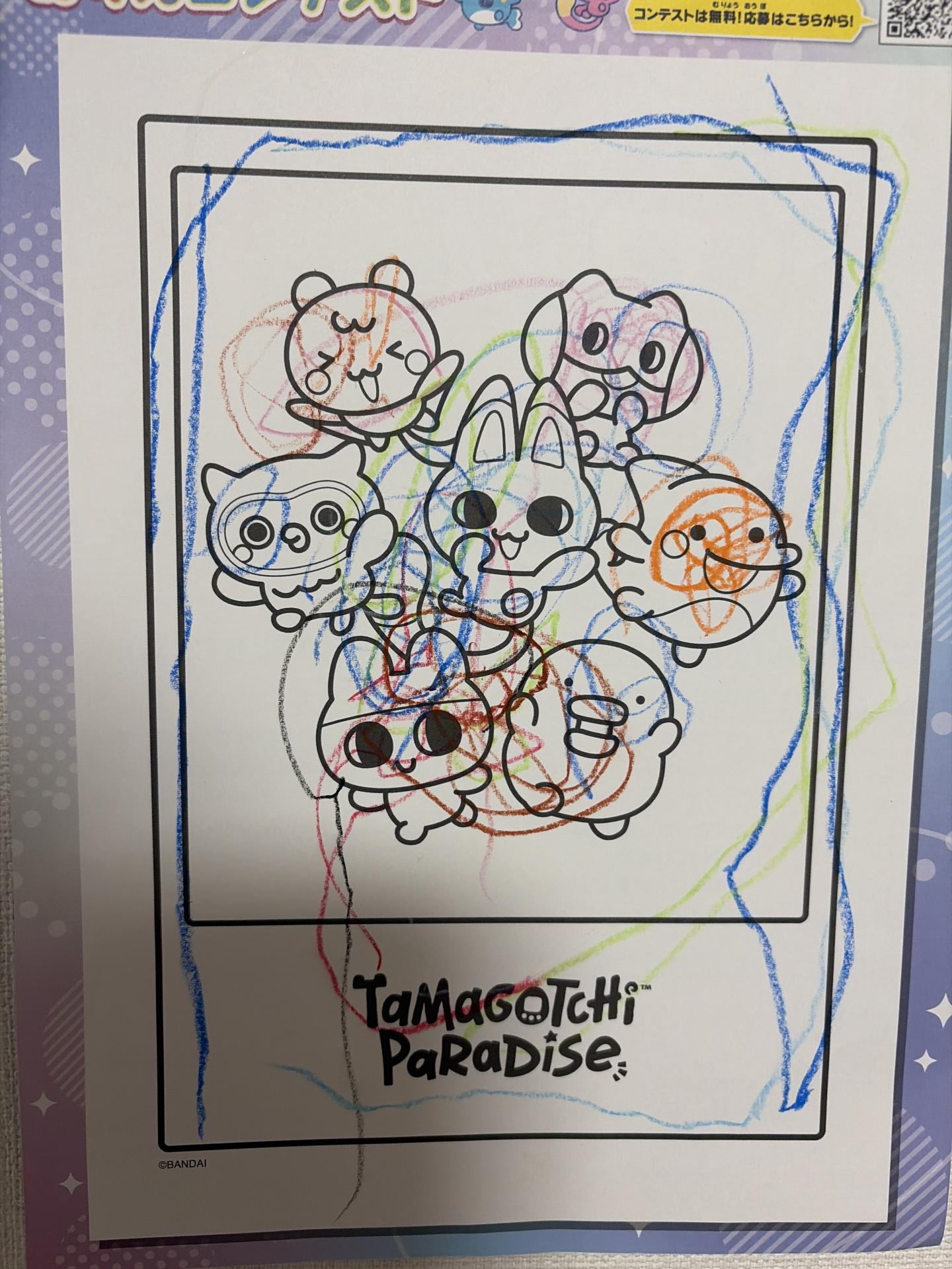 お家でははじめてのぬりえ。縁をなぞって、キャラクターにも丸を付けたよ!